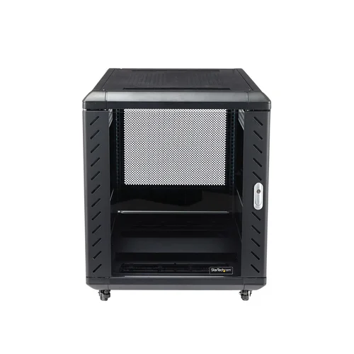 Securely store servers, network and telecommunications equipment in this 12U server rackThis server rack provides 12U of storage space in a sleek secure cabinet for storing EIA-310 compliant 19" rackmount devices such as Dell, HP and IBM servers along with telecommunication and A/V equipment. The rack creates a robust storage solution supporting a total load capacity of 800 kg. (1763.7 lbs).Hassle-free equipment installationThis rack has been engineered with different features that enable you to easily incorporate plenty of equipment.With adjustable mounting rails you can easily change the rail depth to up to 29 in. (740mm). These rails ensure the cabinet is widely compatible with your standard rackmountable equipment. The added depth also provides support for additional cable and power management behind your equipment.The rack features brushed ports on the ceiling and floor panels that enable you to easily run cabling to the inside and outside of the cabinet, for discreet cable management. The floor and ceiling panels can also be removed enabling you to customize your setup, and the rack features grounding lugs that enable you to ground your equipment for added protection.Securely protect your equipment while still being able to see itTo ensure you have full visibility of your equipment while securely locking it up, this rack has a stylish glass window on the front door. The glass door looks great in any server room, and gives you the freedom to clearly monitor equipment without the hassle of opening your rack.The rack also has removable side panels with independent locks quick-release mechanisms that enable you to easily access your equipment while still keeping it secure.Save money, with a cost effective, compact shipping containerThe cabinet comes in a flat packed box to reduce shipping volume, which significantly reduces your costs in shipping. Plus, because the rack is packaged efficiently, you can easily store the cabinet, for deployment at a later date.Maximum Maneuverability, with casters includedThe cabinet features casters ensuring hassle-free access to the rear mounted equipment, while providing ease of mobility around your office, studio or server room. Plus, the width and height of the rack fits through standard doorways, giving you the freedom to wheel your server rack into different rooms.Ensure your equipment is running at an optimal temperatureThe rear door on the rack is mesh, and the front glass door is vented, working together to increase airflow to provide passive cooling that's cost effective and ensures your equipment runs at an optimal temperature.The top ceiling panel features square venting holes that are cage nut compatible, which provide mounting points that enable you to add additional equipment at the top of your rack.The RK1236BKF is backed by a lifetime StarTech.com warranty with free technical support.The StarTech.com Advantage