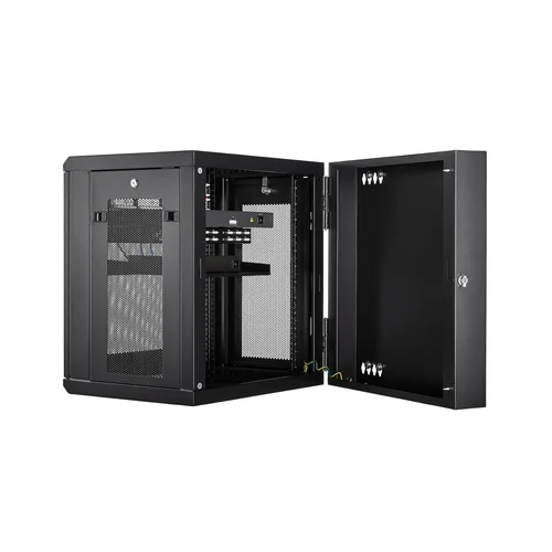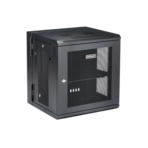 Securely mount your servers, network and telecom equipment to the wall, with this ventilated, lockable enclosureThis 12U server or network rack cabinet lets you mount your EIA-310 compliant equipment to the wall, in a secure enclosure that has a hinged rear door for easy access to your equipment. The enclosure features adjustable mounting depth from 2 to 16 in. to provide a robust storage solution for your rack-mount equipment.To provide secure stability for your heaviest equipment, this rack offers 4-post mounting, supporting a higher weight capacity per U than 2-post racks and supporting a total load capacity of up to 200 lb. (90 kg).Save space in your office or server roomSave valuable floor space by wall-mounting the enclosure. The wall-mounted design makes this enclosure the ideal solution for optimizing equipment storage in your classroom, retail store, server room or office. This rack also includes a 1U shelf that gives you a stable surface for placing equipment that's not rack-mountable or storing your tools.Easily access your servers and network equipmentThe wall-mount network rack makes it easy to access your equipment and cabling, with a rear hinge that swings the enclosure away from the wall. By flipping the enclosure 180 degrees upon installation, you can reverse the direction of the hinge so that the enclosure can swing open from left or the right, depending on your preference.The 12U network cabinet features a removable and reversible front door and removable side panels, each with quick-release mechanisms, so you can easily access your equipment. Plus, each door and panel on this rack features an independent lock, ensuring your equipment is secure.For hassle-free cable management, the rack includes a 3 meter roll of hook-and-loop cable tie that makes it easy to keep your cables neat and tidy by binding them together or binding them to the rack. The self-gripping fabric can be cut to any size, enabling a wrap-around solution for the cables of any rack-mount equipment.Securely protect your equipmentThis server rack enclosure features heavy-duty steel construction, with lockable doors at all entrances. For hassle-free equipment installation, the mounting rails on the rack can be switched for use with square holes and cage nuts, or tapped rails.To ensure your equipment is running at an optimal temperature, the server rack/cabinet promotes passive cooling. It features mesh doors and vented top and bottom panels for maximum airflow.For simple and sturdy mounting, the rack's mounting holes are positioned 16 in. apart, so you can securely attach it to a wall using wall studs.The StarTech.com Advantage