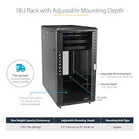 Securely store servers, network and telecommunications equipment in this 18U server rackThis 18U server rack cabinet provides plenty of storage space in a sleek secure cabinet for storing EIA-310 compliant 19 inch rackmount devices such as Dell, HP and IBM servers along with telecommunication, A/V and IT equipment.Hassle-Free Equipment InstallationThis knock down server rack has been engineered with different features that enable you to easily incorporate plenty of equipment. With adjustable mounting rails you can easily change the rail depth to up to 32 in. (813 mm).Securely Protect Your EquipmentTo ensure you have full visibility of your equipment while securely locking it up, this rack has a stylish glass window on the front door. The server rack with glass door also has removable side panels with independent lock with quick-release mechanisms that enable you to easily access your network equipment.Maximum ManeuverabilityThe server rack with wheels ensures hassle-free access to the rear mounted equipment, while providing ease of mobility around your office or server room. Once the network equipment enclosure is at the intended location you can stabilize it using the built-in leveling feet in floor standing applications.The Choice of IT Pros Since 1985StarTech.com conducts thorough compatibility and performance testing on all our products to ensure we are meeting or exceeding industry standards and providing high-quality products to IT Professionals. Our local StarTech.com Technical Advisors have broad product expertise and work directly with our StarTech.com Engineers to provide support for our customers both pre and post-sales.The RK1836BKF is backed by a lifetime StarTech.com warranty with free technical support.The StarTech.com Advantage