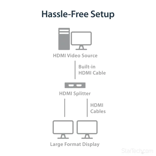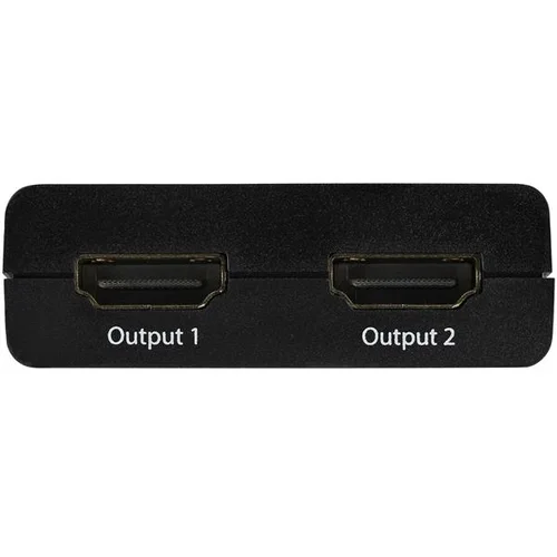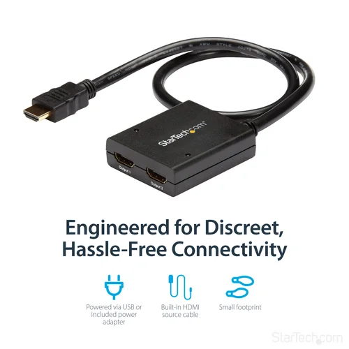 Split an HDMI audio/video source to two separate HDMI Displays, with support for HDMI 4K, and Power through a nearby USB port.The ST122HD4KU 2-port video splitter supports Ultra HD (4K) ensuring astonishing picture quality, four times the resolution of high-definition 1080p, while sharing a 4K HDMI video source between two HDMI displays.The 4K splitter is backward compatible with previous HDMI revisions, supporting 1080p / 720p HDMI video resolution devices such as computers, Blu-ray players and cable TV set-top boxes. Even if you don't require 4K video today, the video splitter ensures you'll be ready to take advantage of tomorrow's display technology while still working with the devices you already have. Plus, this splitter supports 3D, enabling you to use the splitter with your stereoscopic 3D video source on active or passive 3D displays.For a hassle-free setup you can power the HDMI splitter with the included USB cable, or power adapter depending on which is most convenient for you. Plus, the splitter features a built-in HDMI source cable, which lets you connect it directly to your HDMI source without the expense of additional cabling.The ST122HD4KU is backed by a StarTech.com 2-year warranty, and free lifetime technical support.The StarTech.com Advantage