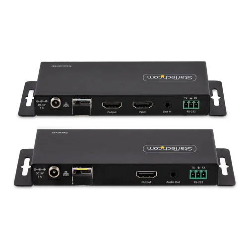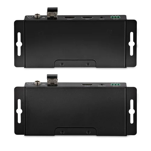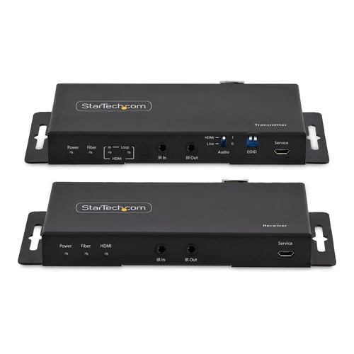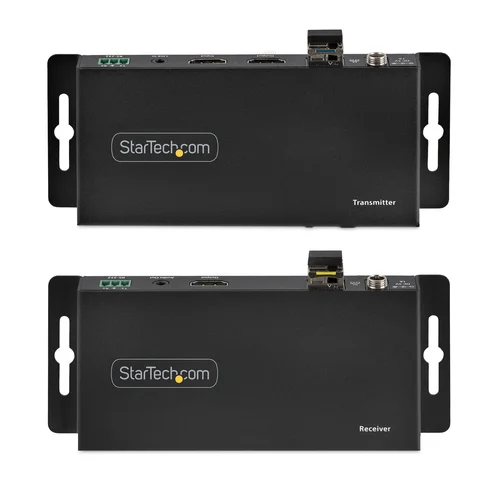 Extend an HDMI® audio and video signal over optical fiber at resolutions of up to 4K 60Hz with 7.1 channel audioThis HDMI over Fiber Extender Kit extends an Ultra HD (UHD) 4K 60Hz HDMI signal, with 7.1ch audio, up to 3300ft over Single Strand LC fiber cable. This converter kit includes both the transmitter and receiver for a complete end-to-end solution.Works with Single Mode or Multimode FiberThis HDMI extender works over Single Mode or Multimode fiber cabling, allowing the utilization of existing fiber infrastructure. The single strand optical fiber provides full-bandwidth video while being immune to Electro-Magnetic Interference (EMI), making it ideal for use in challenging environments.Fiber TypeSingle ModeMulti ModeSupported DistanceUp to 3300ft (1000m)Up to 1000ft (300m)Audio CapabilitiesAudio extraction functionality enables playback of the HDMI source audio via the 3.5mm audio output on the receiver unit. Simultaneous audio playback across both HDMI and 3.5mm outputs is supported, providing flexibility for a variety of audio setups.Hassle-Free InstallationThe point-to-point connection, using LC single strand fiber between the A/V transmitter and receiver, eliminates the need for IP configuration, drivers, or network equipment. The HDMI extension kit features a durable steel housing with built-in mounting brackets, allowing for a tidy and secure installation.The HDMI over Fiber kit features a local HDMI output and IR/serial extension for a convenient and versatile setup. Ideal for setups that include projectors with RS232 controls, or A/V equipment with IR remote controls. The enhanced EDID Copy functions ensure the correct display information is used during the setup process. LED indicators allow for status monitoring. 8kV air and 6kV contact Electrostatic Discharge (ESD) protection ensures the safety and longevity of the equipment.This product is backed for 2-years, including free lifetime 24/5 multi-lingual technical assistance.The StarTech.com Advantage