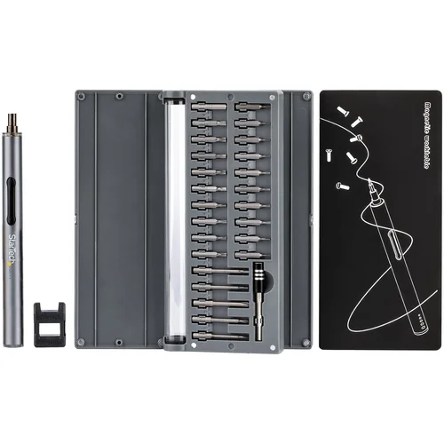 This cordless electric screwdriver set includes 55 bits and a magnetic work pad for efficient electronic repairs.