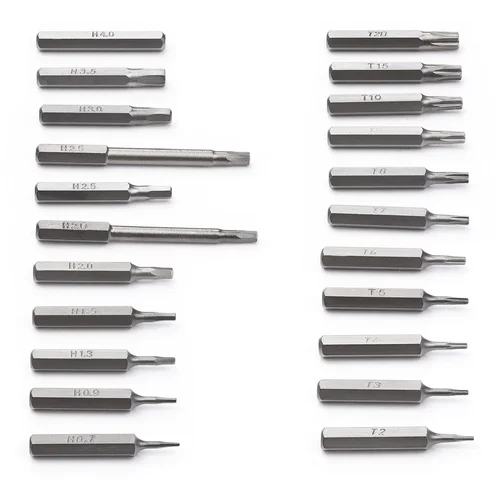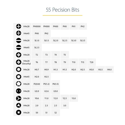55 Bits, 50x H4x28mm, 5x H4x45mm | Hard Case | Magnetic Work Pad | Magnetizer/Demagnitizer | Bit ExtenderThis cord-less screwdriver is the ideal tool to dismantle and reassemble electronic devices during repairs. The battery powered driver set includes a precision electric screwdriver (2 x AAA batteries included), 55 micro bits, a magnetizer/demagnetizer and a magnetic work pad, housed in a durable hard case. A complete range of bits ensures compatibility with most major brands of smartphones, tablets and laptops including but not limited to Apple iPhones, iPads, Macbooks, Samsung Galaxy, HP and Acer Chromebooks, Lenovo ThinkPads.Precision Electric Driver with LED Work Light and Forward/Reverse ModesThe premium electric driver included with this kit has several features designed for hassle-free repairs.• A built-in LED work light illuminates the area that the driver is operating in, ensuring you can clearly see shadowless details, regardless of the lighting in your repair area.• Battery operated forward and reverse modes with 0.25 to 0.35 N.m of torque, ensures you can effortlessly install and remove screws without the wrist strain that comes with manual drivers.• The included magnetizer/demagnetizer gives you the option to magnetize the driver to ensure screws are easy to install/remove without losing them. Plus, the head can be demagnetized for IT repairs on devices that may be sensitive to magnets.• Quick changing batteries ensure uninterrupted operation.55 Specially Selected Micro BitsThis kit features 55x4mm bits specially selected for extensive compatibility with major brands of smartphones, tablets and laptop computers. Bits Included:• Philips (crosshead) H4x28: PH0000, PH000, PH00, PH0, PH1, PH2• Philips (crosshead) H4x45: PH0, PH2• Slot (flathead) H4x28: SL1.0, SL1.5, SL 2.0, SL2.5, SL3.0, SL3.5• Slot (flathead) H4x45: SL2.5• Torx H4x28: T2, T3, T4, T5• Torx Security H4x28: T6, T7, T8, T9, T10, T15, T20• Hexagonal H4x28: H0.7, H0.9, H1.3, H1.5, H2.0, H2.5, H3.0, H3.5, H4.0• Hexagonal H4x45: H2.0, H2.5• Pentalobe H4x28: P2(0.8), P5(1.2), P6(1.5)• Spanner H4x28: U2.0, U2.6, U3.0• Tri Wing H4x28: Y0.6, Y1.0, Y2.0, Y2.5, Y3.0• Triangle H4x28: 2.0, 2.3, 2.5, 3.0• Robertson H4x28: (square) S0, S1, S2Durable Case and Magnetic Work PadIncluded with the electric driver is a durable hard plastic case, and a convenient magnetic work pad. The carrying case features peg holes for each included bit as well as a sleek compartment for the driver, while the magnetic work pad ensures your screws and bits will stay where you place them, until you're ready use them.CTK55PCEDRIVE is backed by a StarTech.com 2-year warranty with free 24/5 multi-lingual North American based technical support. StarTech.com has been the IT professionals' choice for over 30 years.The StarTech.com Advantage