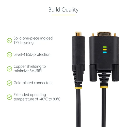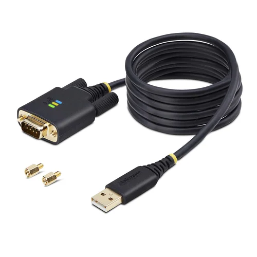 Add an RS232 serial port to a laptop or desktop, using an available USB-A portAdd RS-232 serial communication support to USB-A enabled Data Terminal Equipment (DTE - e.g., desktop or laptop), using this 6.6-foot (2-meter) straight through USB to Serial Adapter Cable.Serial Port ExpansionThe USB Serial Adapter adds an RS-232 serial DB/DE-9 (male) connector to a desktop or laptop via a USB Type-A port. Secure the adapter to a serial device, using pre-installed and removable slotted D-Sub thumbscrews or install the included DB-9 Nuts for compatibility with other serial peripheral devices or cables.LED IndicatorsData transmission and reception LED indicators on the adapter provide real-time monitoring of port activity. The USB LED indicates when the adapter has successfully enumerated on the desktop or laptop. All the LEDs aid with diagnostics and troubleshooting.Seamless ConnectivityThe adapter is compatible with Windows, macOS, ChromeOS, and Linux. Drivers automatically install to Windows 7 and newer versions, macOS 10.15 and above, and Linux. The USB to RS-232 adapter features COM retention, which automatically reassigns the COM port value if the cable is disconnected and reconnected, or if the system is rebooted.Built To LastThe rugged TPE construction and Level-4 ESD protection (15kV air and 8kV contact) enhance the reliability and longevity of the USB to Serial Adapter. Copper shielding minimizes Electromagnetic and Radio Frequency Interference (EMI and RFI). Gold-plated connectors enhance signal conductivity.The StarTech.com Advantage