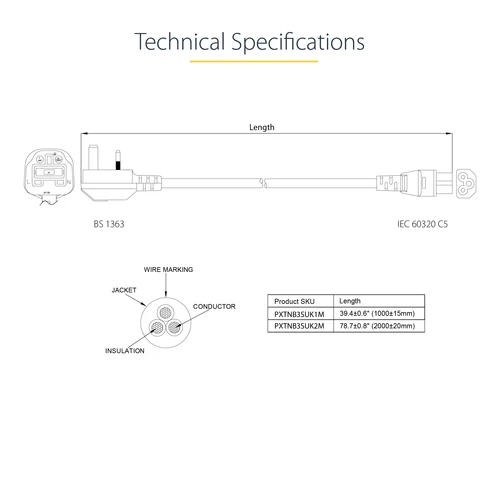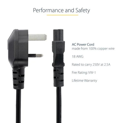 6ft (2m) UK Laptop Power Cord, BS 1363 to C5, 2.5A 250V, 18AWGThe PXTNB3SUK2M 2m Laptop Power Cord features one BS 1363 (Type G) UK power plug and one 3-prong C5 connector, making it a suitable replacement cable for an HP, Toshiba or other compatible laptop equipped with a cloverleaf/C5 power connection.Designed for durability and dependability, this Cloverleaf Power Cord is backed by our Lifetime Warranty.The StarTech.com Advantage