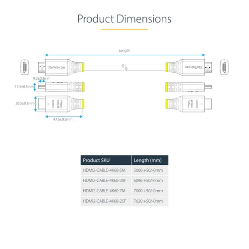 Connect reliably between HDMI UHD devices using this Premium Certified HDMI CableConnect to a 4K UHD TV or monitor, using this Premium Certified HDMI 2.0 Cable. The connector markings enable quick visual identification, distinguishing this cable from other similar-looking or unmarked HDMI cables. Eliminate guesswork and always choose the appropriate cable to support full HDMI 2.0 with Ethernet capabilities.Seamless CompatibilityFor seamless operation between HDMI-enabled devices, the Premium HDMI Cable is Certified for guaranteed HDMI 2.0 performance and backward compatibility. Certified cables provide consistent, reliable performance across multiple resolutions and refresh rates.Durable DesignThis High Speed HDMI Cable features a flexible TPE outer jacket that is tested to withstand 2,000 bending cycles at -/+60 degrees, and routes easily around corners and desk edges. Robust strain reliefs enable convenient positioning of the cable. The durable Gold-plated connectors are rated to operate beyond 10,000 insertions.Supported HDMI 2.0 Features:This Certified HDMI Cable supports full HDMI 2.0 features:• Resolutions up to 4K 60Hz using a compatible HDMI source and display• Supports high refresh rates including 1440p 144Hz and 1080p 240Hz• 21:9 Aspect Ratio support for cinematic viewing experiences• High Dynamic Range (HDR10) for higher contrast ratio and vibrant picture quality• High-Bandwidth Digital Content Protection (HDCP) 2.2 for a secure connection between source and display• Audio Return Channel (ARC) for sending audio from the TV back to an AV receiver or soundbar• Up to 32 Uncompressed Digital Audio Channels• HDMI Ethernet Channel (HEC) for network connectivity over HDMI• Backward compatible with previous HDMI versionsThis HDMI 2.0 Cable is constructed with braided aluminum mylar shielding to minimize EMI for clear, consistent audio/video output and long-term reliable performance.The StarTech.com Advantage
