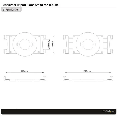 Portable Tablet Mount | For 6.6" to 7.8" Wide Tablets | Carrying Bag IncludedThis adjustable tablet tripod stand is perfect for delivering presentations. The stand fits tablets ranging in size from 6.6 to 7.8" in width and up to 0.45" in thickness. Use it with your Apple iPad (including the 10.2" iPad and 11" iPad Pro) or other compatible tablet.This TAA compliant product adheres to the requirements of the US Federal Trade Agreements Act (TAA), allowing government GSA Schedule purchases.Perfect for PresentationsThe tablet stand lets you use your tablet to deliver powerful presentations, while you stay focused on your audience and the content you're delivering. You can use your tablet as a visual cue or teleprompter, without having to hold it or repeatedly look down at it while you're speaking.Adjustable Height and Viewing AngleUse the tripod while you're sitting or standing. The height is easy to adjust - from 29.3 to 62" (74.5 cm to 157.5 cm). You can also rotate the tablet 360 degrees to change from landscape to portrait position and tilt the screen to your preferred viewing angle. Plus, the tablet holder is detachable, with quick-swap attachments that let you remove the tablet from the stand and place it back in at any time.Portable Tablet Tripod StandThe tripod folds up nicely and comes in a handy carrying bag for portability. Setup is easy - just extend the collapsible tripod stand to the height you need, lock it in place, and mount your tablet.Other Applications• Shoot videos or photos with no camera shake• Give lectures• Portable displays• Tradeshow kioskSTNDTBLT1A5T is backed by a 2-year StarTech.com warranty and free lifetime technical support.The StarTech.com Advantage