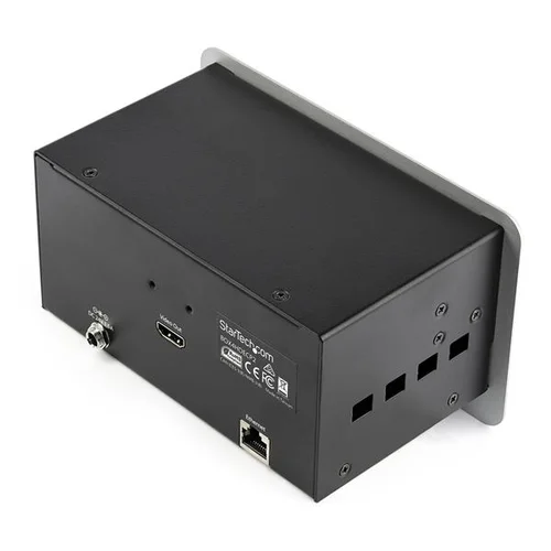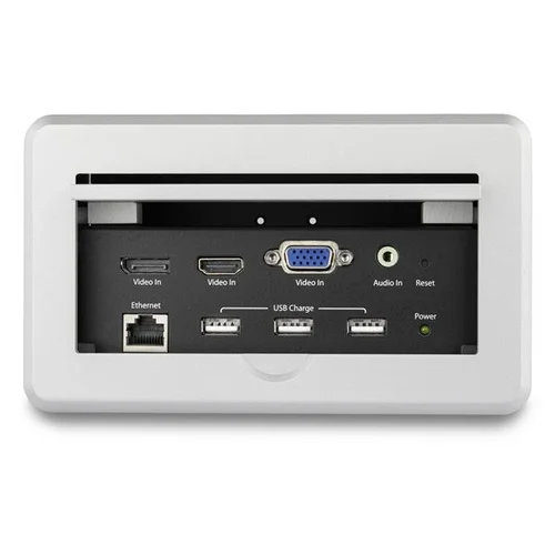 Interconnect Box | HDMI, VGA and DisplayPort Inputs | HDMI OutputThis conference table connectivity box for A/V installs in your table or lectern to provide A/V, networking, and USB charging connectivity in your boardroom, auditorium, or classroom. The box makes it easy to connect HDMI, DisplayPort and VGA laptops to your room’s large HDMI display, and provides LAN and USB power connectivity for charging USB devices. The box also provides some boardroom cable management by hiding connectivity cables in your table.Collaborate Easily Using the Big ScreenThe table box enables presenters in your conference room to easily share their laptop screen on the room’s large display or projector, with supported resolutions up to 4K 30Hz. To share video from virtually any laptop, the table box supports HDMI, VGA and DisplayPort inputs and automatically outputs the most recently connected input to the HDMI display. Provide Convenient USB Charging and Wired Network Connectivity Enabling visitors in your conference room to charge their iPhone, iPad, smartphone, or tablet, the table box features three USB charge ports. Plus, the box features an Ethernet pass-through port to provide secure wired network connectivity in rooms where Wi-Fi isn’t available. Add Style and Technological Sophistication to Any Room The boardroom interconnect box has an aluminum finish that complements your space. The hideaway panel eliminates clutter by discreetly covering the connection ports when they’re not in use. TAA compliant BOX4HDECP2 is backed by a 2-year warranty and free lifetime technical support. The StarTech.com Advantage- Easily collaborate by connecting your HDMI, VGA or DisplayPort laptop to your conference room’s HDMI display, from a single access point- Charge your phone or tablet, with three accessible USB charge ports- Add style and technological sophistication to your conference room or auditorium by building an A/V connectivity box into your table with a pop-up panel that hides ports when they’re not in use