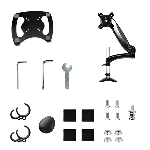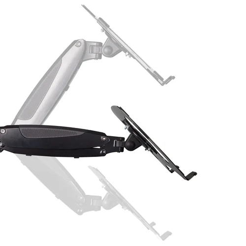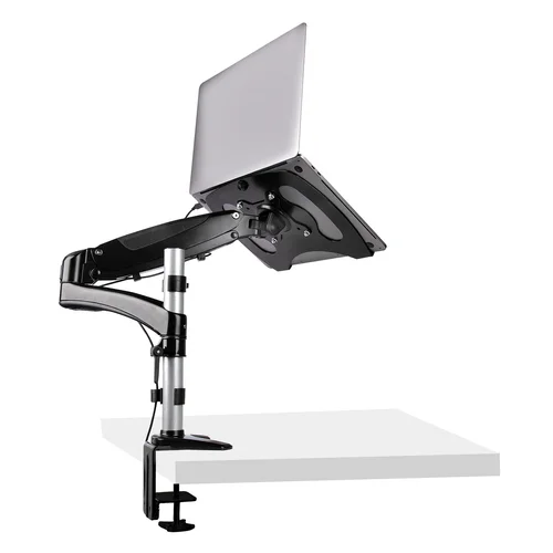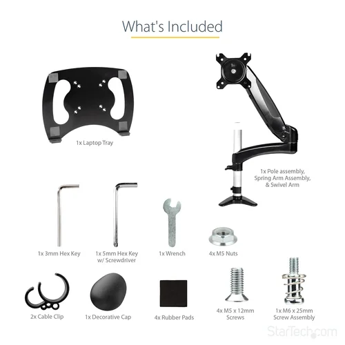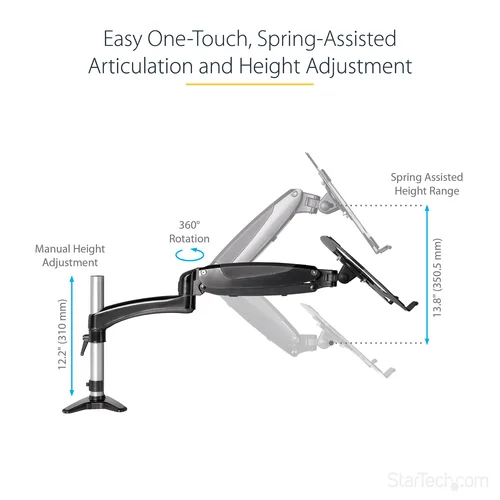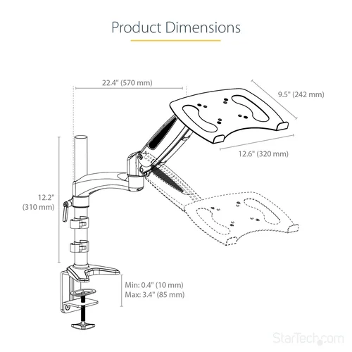 Monitor Arm with Laptop Tray | Up to 34" monitors & 8kg in weight | C-Clamp MountingThis Desktop Mount Laptop Arm enables you to raise your laptop off your desk and position it to increase ergonomics and productivity. Alternatively, you can mount a monitor up to 34" (16:9 or 21:9). The laptop/monitor arm supports up to 17.7lb / 8kg in weight, and it features cable management, one-touch/spring-assisted height adjustments along the 12.2" pole while extending up to a total height of 22" from the surface of the desk.Laptop and Monitor SupportThe laptop tray offers an area of 12.6"x9.5" to support your laptop up to 17.7lb/8kg, and it is fully adjustable to your viewing angle and height. When not using this arm as a laptop mount, you can mount monitors up to 34".The VESA mount offers a full range of motion that will adjust to your setup and ergonomics needs, When using it as a notebook mount, your laptop will need additional security at steeper angles (not included).Create an ergonomic setupThis full motion monitor arm lets you extend, tilt, and swivel your monitor and laptop with a full range of motion across multiple axes, with spring-assisted height adjustments for effortless positioning. It makes it easy to create an ergonomic work environment that's tailored to your specific needs.The monitor arm is perfect for smaller work environments, like cubicles, providing everything you need while using less space.Easy InstallationInstall this laptop/monitor arm along the edge of your desk, table or counter using the C-clamp that can be tightened by hand. And it supports desks with up to 3.3 in (8.5 cm) in thickness.ARMUNONB1 is backed by a StarTech.com 5-year warranty and free lifetime technical support.The StarTech.com Advantage