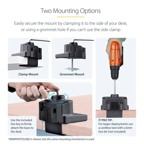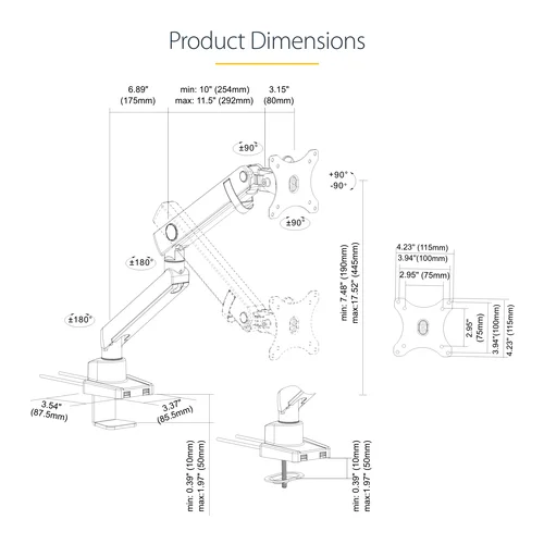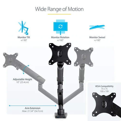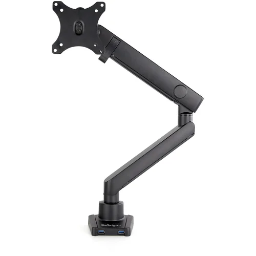 Single Arm Monitor Mount | VESA 75x75 100x100 | Integrated Cable ManagementFree up space while creating an ergonomic work environment. This desk-mount monitor arm makes it easy to securely mount and adjust a 17" to 34" display above your desk.Adjust Your Monitor for Ideal ViewingThe single arm monitor mount extends up to 18.4" (467 mm) so it's easy to find the right viewing angle. Swivel your monitor +90/-90 degrees or tilt your screen +90/-90 degrees for comfortable viewing. You can even rotate it 90 degrees for landscape or portrait viewing.One-Touch Height AdjustmentWith up to 17.5" (445 mm) of height adjustment, the slim monitor-mount arm features a mechanical spring that makes it easy to raise or lower your display offering a toolless adjustable height range of 10.1". Adjust the tension according to the weight of your monitor for effortless movement.Easy InstallationThe VESA mount monitor stand is easy to install (desk C-clamp or grommet mount) and offers built-in cable management and dual USB 3.0 port passthrough for connecting your computer. The detachable VESA mount makes it simple to attach your monitor.The Choice of IT Pros Since 1985StarTech.com conducts thorough compatibility and performance testing on all our products to ensure we are meeting or exceeding industry standards and providing high-quality products to IT Professionals. Our local StarTech.com Technical Advisors have broad product expertise and work directly with our StarTech.com Engineers to provide support for our customers both pre and post-sales.ARMSLIM2USB3 is backed by a 2-year StarTech.com warranty and free lifetime technical support.The StarTech.com Advantage