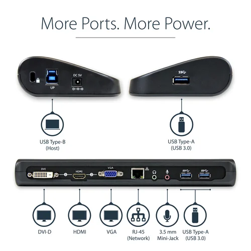 Maximize your productivity with this Dual Monitor USB-A Docking Station featuring Gigabit Ethernet, USB Hub, and AudioThis USB 3.0 dock combines three USB 3.0 ports, headphone and microphone audio connectors, and a Gigabit Ethernet RJ45 port, into a single docking station for maximum productivity.Display AdaptabilityOffering flexible dual video combinations right out-of-the-box, this universal laptop docking station features HDMI, DVI and VGA external monitor outputs. Each video output supports HD video resolutions (2048x1152 max) and HD video playback for an ideal solution to expanding your notebook's video capability.Available display combinations:• HDMI + VGA• HDMI + DVIIntegrated USB HubThe built-in USB hub features three USB 3.0 ports for connecting extra peripherals such as external hard drives or a wired mouse, as if they are connected directly to your laptop.Direct Ethernet ConnectivityThe integrated RJ45 Ethernet port supports speeds of 10/100/1000 Mbps, giving you an instant connection to a wired network.StarTech.com laptop docking stations can be used for cost savings and faster deployment with just a single cable. This USB 3.0 Docking Station is backed by a competitive 3-year warranty and free lifetime Technical Support.The StarTech.com Advantage