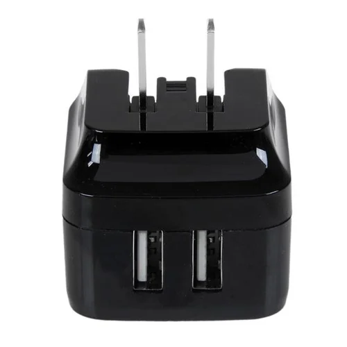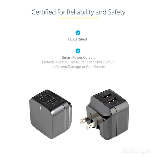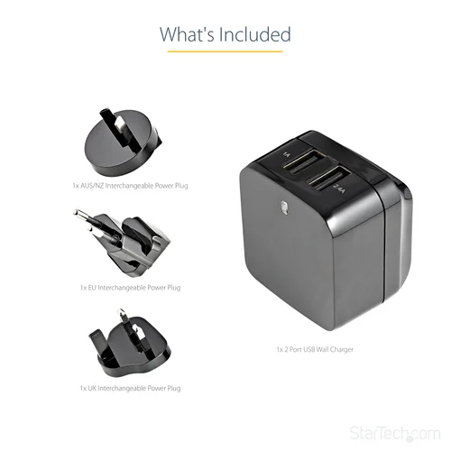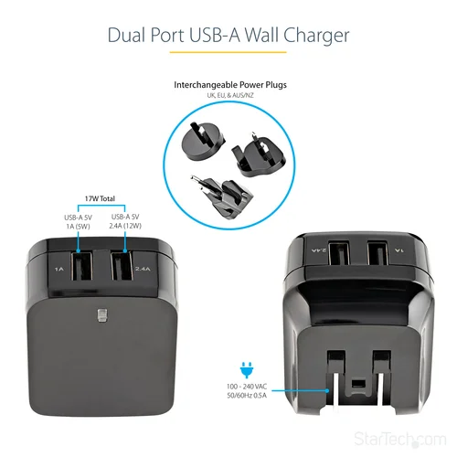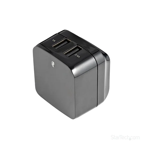 Charge your tablet and your phone simultaneouslyPlanning an international business trip or vacation? Now you can keep your mobile devices charged while you're away, without having to worry about whether or not the adapter you use at home will work overseas. The versatile travel charger ships with interchangeable power plugs that let you plug in and charge your devices nearly anywhere you go around the world. Plus, you can charge two of your devices at the same time. This dual-port USB wall charger lets you charge two mobile devices at once, using a single USB wall charger, so you won’t have to wait until one of your devices is fully charged before charging another.International travel – universal power adapterThe wall charger includes a universal power adapter, which lets you plug in to any electrical socket almost anywhere in the world. So, no matter where you are travelling to, you can rest assured that you’ll be able to keep your mobile devices charged and ready to use.Simultaneous charging – dual USB charge portsWith one 1A port for charging your smartphone or iPhone, and a 2.4A port for charging your iPad or other tablet, you’ll always have the necessary charging power for your mobile devices. Whether you’re charging two phones at the same time or charging a phone and a tablet, you can ensure all of your mobile devices are ready when you need them.Compact and lightweight – portable designThe portable USB wall charger features a folding North American plug that tucks away nicely to fit inside your laptop bag, purse, backpack or other carrying case, making it the perfect mobile accessory for any carry-on. Plus, you can easily throw in the correct international plug for your destination and you’re all set to go.Once you land you can swap out the plugs and be ready to charge in the airport, in your hotel room or just about anywhere you can find a wall outlet. The USB2PACBK is backed by our 2-year warranty to ensure dependable performance.Note: Some mobile devices such as certain Samsung and BlackBerry devices use proprietary power connections which are not compatible with aftermarket chargers. Please consult the manufacturer's documentation to ensure compatibility with the USB2PACBK.The StarTech.com Advantage- Plug in and charge your devices almost anywhere in the world- Ensure all your mobile devices are charged and ready when you need them- Compact design fits nicely into any carrying case