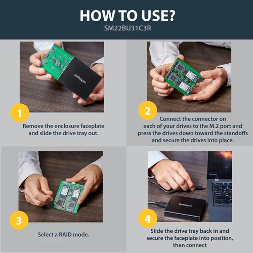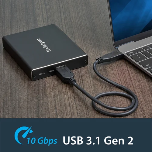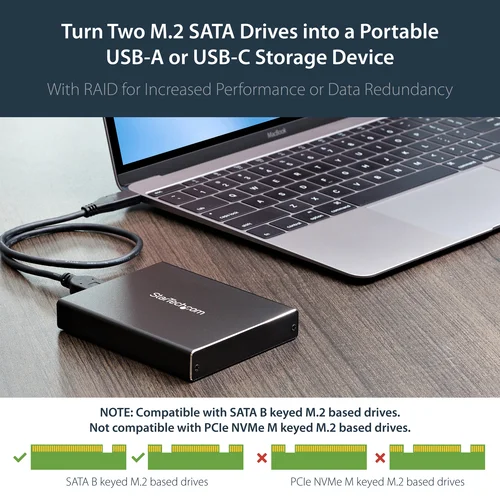 Turn two M.2 SATA drives into ultra-fast, portable storage with RAID for increased performance or redundancyThis dual M.2 SATA enclosure with RAID makes it easy to add ultra-fast, portable external storage to your USB-C or USB-A enabled laptop, tablet, smartphone or desktop computer. Its multiple RAID modes provide increased capacity, improved performance, or data redundancy.Access your external data at greater speedsQuickly access, transfer, and backup your files wherever you go. This dual-slot M.2 RAID enclosure enables you to easily access your data by creating a high-performance, ultra-portable storage solution using two M.2 (NGFF) SATA SSDs. It’s ideal for creative professionals, such as photographers and videographers, as well as professionals in corporate, educational and government sectors who need fast access to important data files, while out in the field or back at the office.The RAID enclosure enables you to leverage the speed of your M.2 (NGFF) SATA drives by taking advantage of USB 3.1 Gen 2, with data transfer rates of up to 10Gbps. It ensures easy access to your files for data migration and data backups so that you can safeguard important data at all times.Increase performance and data redundancyWith multiple RAID options, the M.2 RAID enclosure enables you to gain increased storage size, performance, or redundancy. You can enjoy the peace of mind of knowing your files are continually backed up, or take advantage of greater speed and capacity offered by a combined solution. The enclosure supports RAID 0, RAID 1, Spanning, and JBOD, enabling you to choose your preferred backup mode. It also supports SSD TRIM to prolong drive lifespan and performance.Make your data more portableThe dual M.2 SATA enclosure provides a highly portable storage solution. With its compact design, you can tuck it away inside your laptop bag or carrying case and take it anywhere - to the office, the lab, or for mobile use, so that you can access your data wherever you go. Engineered with a solid aluminum housing, the dual-slot M.2 SATA enclosure helps to safeguard your data wherever you go.The M.2 SATA RAID enclosure is powered directly from the USB port on your device, so no external power is required. It comes with two USB cables (USB-C to Micro-B and USB-A to Micro-B) for flexible use with the latest laptops and tablets equipped with a USB-Type C port as well as legacy devices. The enclosure is OS independent, with no additional software or driver installation required, and is compatiIt’s also compatible with a Thunderbolt 3 USB-C port. The SM22BU31C3R includes all required drive installation tools and hardware and is backed by a StarTech.com 2-year warranty and free lifetime technical support.The StarTech.com Advantage- Maximize the performance of your M.2 (NGFF) SATA drives with USB 3.1 Gen 2 (10Gbps) connectivity- Supports RAID 0, RAID 1, JBOD and SPAN (BIG) for optimal performance, capacity and redundancy- Supports all common M.2 SATA SSDs, and enables you to mount multiple drive lengths: 30 mm (2230), 42 mm (2242), 60 mm (2260) and 80 mm (2280)