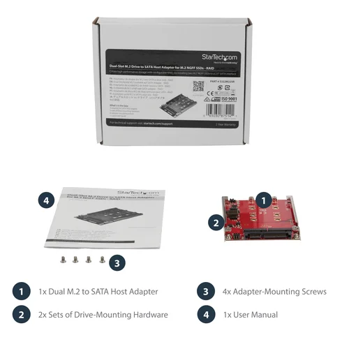 Create high-performance storage with configurable RAID, by installing two M.2 SATA SSDs into a 2.5” SATA interfaceBoost your system performance by enhancing the capacity, speed and security of your data storage. This two-drive M.2 to SATA adapter lets you install two M.2 SATA drives instead of a SATA platter drive, in a single 2.5” drive bay, and increase your storage options by configuring a powerful RAID array.Build a RAID array to enhance system performanceThe dual M.2 to SATA adapter supports multiple RAID modes, including RAID 0, 1, or spanning, helping you to achieve greater SSD capacity or data redundancy, depending on your selected RAID mode. The SSD adapter also supports non-RAID operation (JBOD) when paired with a port-multiplying SATA controller, so both drives can be used independently of one another.Maximize file transfer speedsThe M.2 SATA SSD adapter lets you utilize the full potential of your SATA III controller. Using M.2 SATA SSDs in place of a platter drive reduces your data transfer bottlenecks, giving you file transfer speeds of up to 6Gbps. The M.2 NGFF SATA RAID adapter also provides TRIM support to enhance the stability and performance of your M.2 NGFF SSDs.Easy installationThis open-frame adapter is easy to install as it comes with all the necessary installation hardware and doesn’t require any extra software or drivers, to get you up and running quickly.The S322M225R is backed by a StarTech.com 2-year warranty and free lifetime technical support.The StarTech.com Advantage- Install two M.2 SSD drives into a single 2.5” drive bay- Multiple RAID modes supported: RAID 0, 1, spanning, or JBOD- Open-frame steel mounting bracket with 2.5” SATA form factor housing