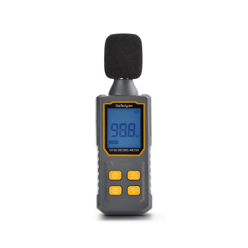 Perform instant, accurate sound measurements in any environment using this portable digital sound meterThe Handheld Digital Sound Meter is equipped with a high-precision microphone that provides accurate decibel readings. The IP54 rating offers resistance against dust and water, making it suitable for use in various environments. Its compact (2x6.4x1.1in / 50x162.6x29.2mm) and lightweight (0.4lb / 190g) design makes it easy to carry and use in a variety of locations.Precision and AccuracyThis portable noise reader is capable of precise readings with a range of 30 to 130dBA, accuracy of +/- 1.5dB, and a resolution of 0.1dB.With the press of a button, switch between minimum and maximum readings. Additionally, choose between fast (1/8s) and slow (1s) readings based on needs. Fast readings capture moment-to-moment changes for dynamic environments, while slow readings provide more stable measurements for overall noise level analysis.User-Friendly DisplayThe portable audio level monitor features an easy-to-read LCD with large fonts for quick, at-a-glance readings, and optional backlight for visibility in low-light conditions. The on-screen battery indicator keeps the user informed, while the five-minute auto-off feature maximizes battery life. The data hold button enables to keep the last reading on the screen for reference.Versatile ApplicationsThe decibel meter is ideal for monitoring server rooms, data centers, office environments, and equipment testing. It provides real-time data to verify the noise and loudness conditions of an area or equipment.Portability and DurabilityMade of durable ABS plastic, the sound meter is lightweight, compact, and convenient to transport. The non-slip design ensures a secure grip, making it ideal for on-the-go measurements in a variety of work environments.The decibel meter features large well-spaced buttons, making it easy to operate even while wearing gloves. This design ensures that users can accurately and comfortably measure sound levels including in environments where protective gear is necessary.The StarTech.com Advantage