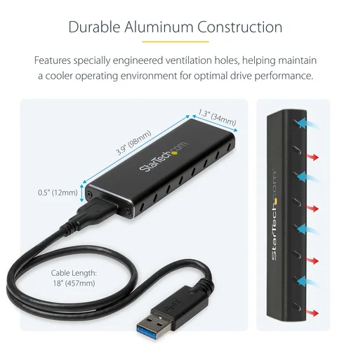 Turn your solid state drive into an ultra-portable pocket driveThe SM2NGFFMBU33 external USB 3.0 to M.2 (NGFF) enclosure turns your SATA M.2 solid state drive into a portable, high speed USB 3.0 drive.Get higher external performance by using an M.2 SSD in place of a platter drive, harnessing the full potential of your USB 3.0 computer system. The enclosure supports UASP, enabling you to achieve transfer speeds up to 70% faster than traditional USB 3.0 when used with a UASP-enabled host computer.This slim, pocket-sized SSD enclosure has been specifically engineered for mobility. The enclosure features a lightweight yet durable design, which fits easily into your pocket or laptop bag. For further convenience, the enclosure is powered entirely using the USB host bus and requires no external power adapter.Durable aluminum construction helps to ensure your drive won't be damaged while you're on the move. Plus, to maximize heat dissipation the enclosure features specially engineered ventilation holes which help maintain a cooler operating environment for optimal performance and a longer life span for your drive.For wide compatibility with all of the common M.2 solid state drives, the enclosure can mount multiple drive heights including: 2242, 2260, and 2280.The M.2 enclosure is backed by a StarTech.com 2-year warranty and free lifetime technical support.Improved Performance with UASPUASP is supported in Windows 8, Mac OSX (10.8 or above), and Linux. In testing UASP performs with a 70% faster read speed and 40% faster write speed over traditional USB 3.0 at peak performance.At the same peak in testing UASP also shows an 80% reduction in required processor resources.Testing results were obtained using an Intel® Ivy Bridge system, a UASP enabled StarTech.com Enclosure, and a SATA III solid state drive.The StarTech.com Advantage