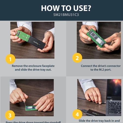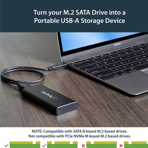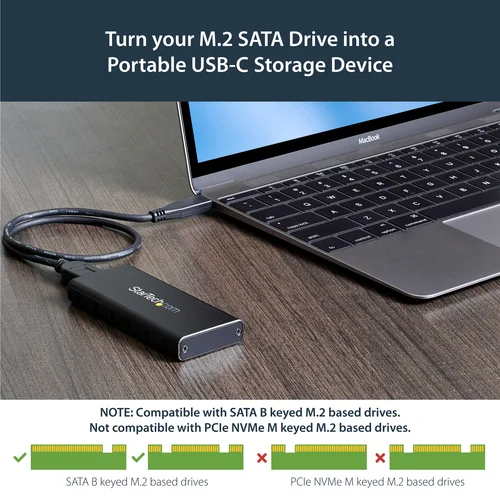 Turn your M.2 SATA drive into an ultra-fast, ultra-portable storage solution for USB-C enabled devicesThis compact M.2 SATA SSD enclosure lets you add highly portable data storage to any laptop or computer with a USB-C port - such as MacBook, Chromebook Pixel, Dell XPS laptops, and many others. It turns your SATA M.2 drive into a high-speed storage solution over a USB 3.1 Gen 2 connection, at up to 10Gbps throughput.A truly portable solutionThis slim, pocket-sized enclosure for M.2 NGFF SATA SSDs has been specially designed for mobility, with a small form factor design that fits easily into your laptop bag. Its lightweight yet durable aluminum housing helps to ensure your drive won’t be damaged while you’re on the move.Ventilation holes help to dissipate heat and help ensure an optimum operating temperature.Maximize the performance of your M.2 SATA SSDLeverage the speed of your M.2 NGFF SATA drive with this external enclosure. It delivers USB 3.1 Gen 2 data transfer speeds up to 10Gbps as well as UASP support, so you can achieve higher transfer speeds when you connect it to a UASP-enabled host computer.The enclosure works with tablets, laptops and desktop computers and is compatible with hosts equipped with Thunderbolt 3 USB-C ports.Broad compatibilityThe enclosure is compatible with all of the common M.2 SATA SSDs, and enables you to mount multiple drive lengths, including: 30mm (2230), 42mm (2242), 60mm (2260), and 80mm (2280).The SM21BMU31C3 is backed by a 2-year StarTech.com warranty and free lifetime technical support.The StarTech.com Advantage- Leverage your SATA M.2 SSD to add fast external storage to your USB-C enabled host (USB-C cable included)- Supports USB 3.1 Gen 2 (10Gbps)- Compatible with Thunderbolt 3 USB-C port