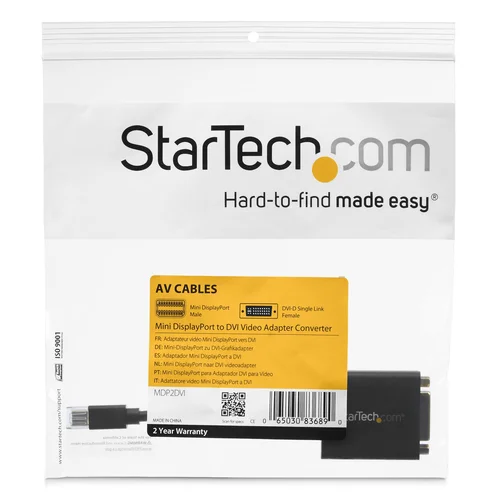 Connect a DVI display to a Mini DisplayPort® equipped PC or MAC®The StarTech.com MDP2DVI Mini DisplayPort DVI Adapter Cable offers a cost-effective DVI/Mini DisplayPort link, letting you connect a DVI computer monitor to a device with a Mini DisplayPort output while saving the expense of upgrading the monitor for compatibility. This Mini DisplayPort adapter is the perfect accessory for any of your MacBook® or Microsoft® Surface™ Pro devices with mDP.MDP2DVI is a passive adapter that requires a DP++ port (DisplayPort++), meaning that DVI and HDMI signals can also be passed through the port.Compatible with Intel® Thunderbolt™, when connected directly to a supporting DisplayPort over Thunderbolt™ I/O port.Backed by a StarTech.com 3-year warranty and free lifetime technical support.The StarTech.com Advantage