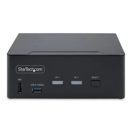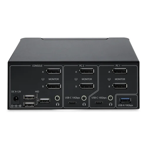 Share a mouse, keyboard, USB (10Gbps) Hub, and dual 8K 60Hz DisplayPort monitors between two DisplayPort-enabled computersThis dual-monitor KVM switch allows users to switch between two USB and DisplayPort-enabled desktops. It allows for sharing of dual-8K 60Hz DisplayPort monitors, a keyboard and mouse, and two USB 10Gbps devices.Dual-8K 60Hz Displays & USB 10Gbps Hub PortsThis TAA-compliant KVM Switch supports dual 8K 60Hz DisplayPort monitors, making it ideal for working with high-resolution graphics or video. It also features two USB 3.2 Gen 2 (10Gbps) hub ports for fast data transfer, and four USB HID ports for the keyboard, mouse, and two additional USB peripherals.Fast Switching with USB EmulationUSB emulation technology enables faster keyboard, video, and mouse switching compared to traditional KVMs. USB Emulation also ensures compatibility with combo keyboards/mice and keyboards featuring extra function keys.Switching OptionsThis Universal KVM Switch offers hotkey or push-button switching options. Hotkeys allow for independent switching of audio, enabling audio playback from one computer while controlling the other. An audible buzzer confirms hotkey input, and LEDs provide a visual status of the selected host.The StarTech.com Advantage