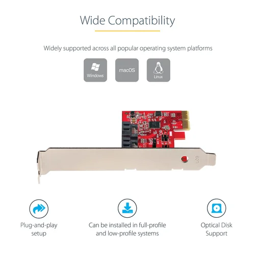 SATA III (6Gbps) | Hardware RAID | PCI Express 2.0 | PCIe x2 Slot | 2x SATA Connectors | Lifetime WarrantyThis 2-port SATA III (6Gbps) controller with RAID enables you to add two SATA 6Gbps Hard Drives (HDDs) or Solid State Drives (SSDs) to your computer system or server via an available PCIe x2 card slot, and build the disks into a hardware RAID array. The card supports SATA III and PCI-Express 2.0 Specifications, and can also be used to add optical disk drives (ODD) like CD/DVD/Blu-ray to your computer.Versatile Hardware RAID ConfigurationsThis RAID controller supports different hardware RAID configurations to meet your specific application:• RAID 0 (striped) - Splits your data evenly across both drives to increase read/write performance, while also increasing the size of your volume storage capacity to the combined total of both drives.• RAID 1 (mirrored) - Exactly copies your data on both drives to provide data redundancy, so your data will be safely backed-up should one of the drives fail.• SPAN (big) - Combines both drives into a single array to increase the size of your volume storage capacity to the combined total of both drives.• JBOD (Just a bunch of disks) - Exposes both drives as individual devices to be treated independently.ASM1062R to Deliver 2-Port SATA 6Gbps PerformanceFeaturing the ASM1062R controller, this SATA card enables the connection of two high-performance SATA 6Gbps drives with a combined total throughput of up to 8Gbps. The SATA drives are connected via two individual SATA ports located on the card (SATA cables sold separately).Wide CompatibilityThe controller card is widely supported across all popular operating system platforms including Windows (7, 8, 10, 11), macOS (10.10 and above) and Linux (2.6.32 and above). Plus, with support for PCIe 2.0 and SATA III Specifications this card ensures backward compatibility with previous generations (SATA I/II, PCIe 1) at lower performance.For managing and configuring RAID functionality, the card supports OS booting on Windows & Linux for BIOS level RAID setup & configuration, and includes an application on Windows for OS level RAID setup, configuration & monitoring. On macOS only software RAID is supported using RAID Assistant.Hassle-Free InstallationThe SATA controller card features plug-and-play installation and can be installed in a full-profile or low-profile computer systems with the full-profile bracket preinstalled, and an interchangeable low-profile (half-height) bracket included.2P6GR-PCIE-SATA-CARD is backed by a StarTech.com lifetime warranty and free lifetime 24/5 North American based, multi-lingual support.The StarTech.com Advantage