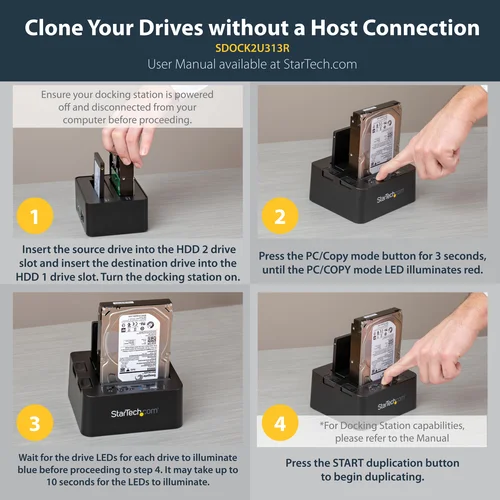 Hard Drive Cloner | 2.5"/3.5" HDD/SSD | USB 3.2 Gen 2 (10 Gbps) to SATA IIIDuplicate drives quickly, at rates of up to 28GB per minute for SSDs, without having to connect to your computer. This duplicator dock offers standalone drive cloning that makes it easy to back up your data and make exact images of your drives. You can also connect the dock to your computer through USB 3.2 Gen 2 (10Gbps), to dock and swap your drives as part of a scalable storage solution.Clone your drives at high speedDuplicating a hard drive or solid-state drive is an effective way to migrate your operating system and data from one drive to another, or create an exact copy for safeguarding your important data. This drive duplicator lets you create a sector-by-sector clone of your drive, including partitions and boot sector information, to ensure data integrity and consistency for sensitive operations such as data recovery.The duplicator dock saves you valuable time with SSD duplication speeds of up to 28GB per minute. You can duplicate a 2.5" or 3.5" SATA SSD or HDD easily, without having to connect the duplicator to a host computer.Transfer files quickly between the dock and your PCThe duplicator dock also provides an external storage solution, letting you dock your drives through USB 3.2 Gen 2 with UASP support, enabling fast data transfer rates of up to 10Gbps. Each drive slot individually supports a high-capacity hard drive or solid-state drive, tested up to 6 TB.Includes two USB cables for versatilityThe duplicator dock comes with two USB cables for flexible use with the latest laptops and tablets equipped with a USB-C™ port, as well as legacy devices. It includes both USB-C to B and USB-A to B cables. The duplicator dock is also compatible with a Thunderbolt™ 3 USB-C port.Designed for easy useThe dock features a top-loading, toaster-style design that makes it easy to insert your drives. It also features drive doors to help stabilize drives that are inserted into the slot and prevent foreign objects from getting into the drive slots.Both tool-less and tray-less, the duplicator dock helps to ensure quick and hassle-free drive insertions. LED indicators let you know, at a glance, the current state of the duplication process, including the specific duplication mode, the HDD status and clone progress. The HDD ejection button enables fast and simple drive removal.For added compatibility with different drive types in duplication and docking applications, the SDOCK2U33RE supports the use of various drive adapters. The below list of StarTech.com adapters have been specifically tested, to ensure compatibility with this drive duplicator:SATA to 2.5in or 3.5in IDE Drive Adapter - SAT2IDEADP2.5in SATA to Mini SATA SSD Adapter - SAT2MSAT25M.2 SSD to 2.5in SATA Adapter - SAT32M225The SDOCK2U313R is backed by a StarTech.com 2-year warranty and free lifetime technical support.The StarTech.com Advantage