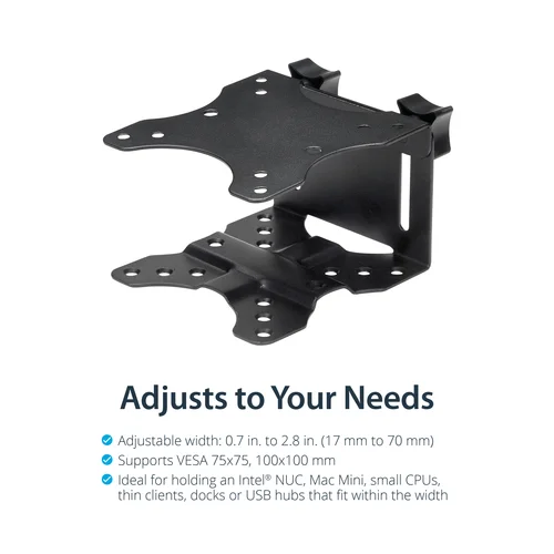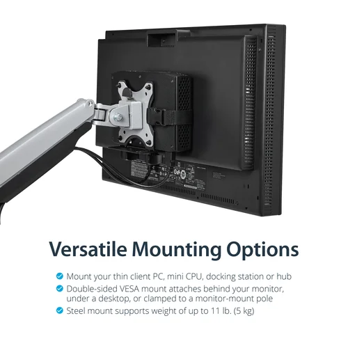 Save space and neatly mount your docking station, thin client or USB hub to a VESA mount, behind your monitor, or under your deskThis thin-client mounting bracket provides an excellent space-saving solution, by letting you mount your thin-client PC or docking station to create a clutter-free workspace.Multiple installation methodsThe versatile double-sided VESA mount offers several installation options, enabling you to mount your thin-client PC or dock to the back of your monitor or under your desktop, or clamp it to a monitor-mount pole. The mount supports 75x75, and 100x100 VESA mount compatibility, making it suitable for most monitors and monitor mounts.Store a variety of productsThis adjustable mount is ideal for holding an Intel® NUC, Mac Mini, most small CPUs, thin clients, docking stations, or USB hubs that fit within the width adjustability of the mount (.7" to 2.8" / 17 mm to 70 mm). The PC mounting bracket is also great for mounting other devices behind displays such as wireless routers, modems, video extenders, and digital signage media players. The mount can support up to 11 lb. (5 kg). It also features an adjustable strap to help keep your devices secure, and rubber pads to secure products with non-parallel surfaces.Unrestricted AccessThe open-frame design of the mount allows unrestricted access to your computer.The ACCSMNT is backed by a StarTech.com 5-year warranty and free lifetime technical support.The StarTech.com Advantage