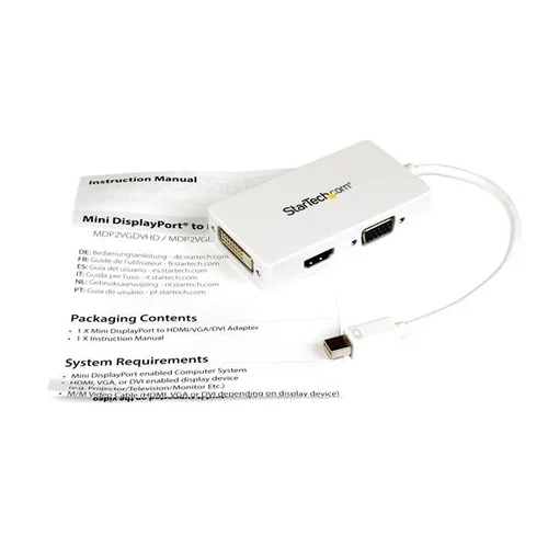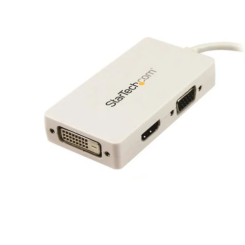 Connect a Mini DisplayPort-equipped PC or Mac to an HDMI, VGA, or DVI DisplayThe MDP2VGDVHDW Mini DisplayPort to VGA, DVI or HDMI converter offers a three-in-one solution for connecting an Mini DP video source (such as any of your MacBook or Microsoft Surface Pro devices with mDP) to a VGA, DVI, or HDMI Display. Ensuring compatibility with almost any display, television or projector, this compact and lightweight adapter offers the ideal plug-and-play solution for travel, or BYOD (Bring Your Own Device) applications around the office.You can walk into any boardroom and be ready to connect, even if you don't know what connection ports are available. The MDP2VGDVHDW maximizes the audio/video connectivity of your MacBook by offering three different output ports, in a single compact adapter.The three-in-one converter is compatible with Intel Thunderbolt, when connected directly to a supporting DisplayPort over Thunderbolt I/O port. Plus, because the converter cable supports video resolutions up to 1920x1200/1080p you can convert a Mini DisplayPort video source to VGA, HDMI, or DVI without sacrificing video quality.The Mini DisplayPort converter requires no power adapter and maximizes portability by easily travelling in your laptop bag with a small footprint and lightweight design.The MDP2VGDVHDW features a sleek white design that looks great next to your MacBook Pro or MacBook Air, and is backed by a 3-year StarTech.com warranty and free lifetime technical support.The StarTech.com Advantage- Maximize portability when traveling, or around the office, with a small foot print, and lightweight design- Ensure compatibility with virtually any display with three-in-one adapter converting Mini DisplayPort to VGA, HDMI, or DVI