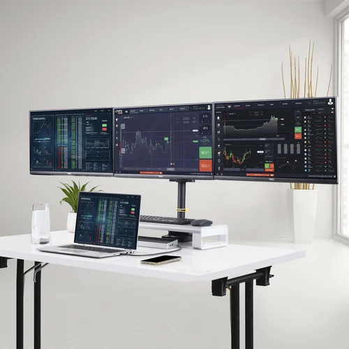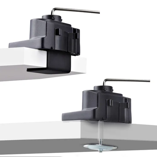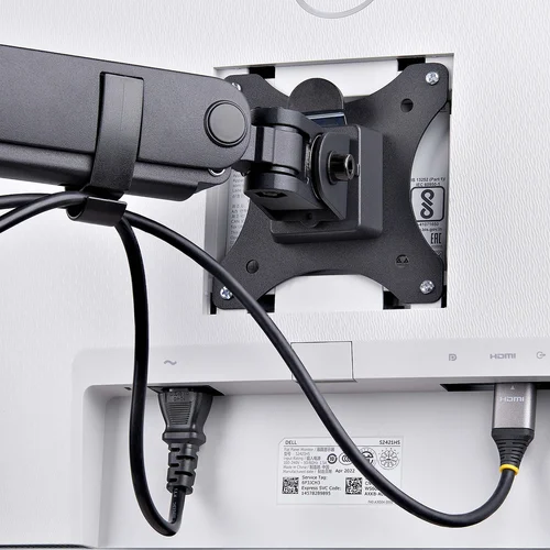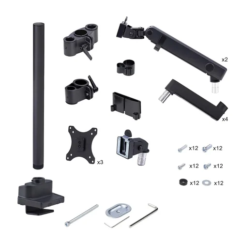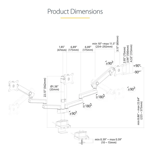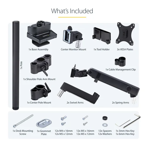 Triple monitor desk mount with support up to 27" monitors with height adjustable articulating armsThis monitor desk mount is designed to support up to three 27-inch displays, creating an ergonomic multi-monitor setup that provides an extensive viewing area for productivity. The mechanical spring-assisted arms allow multiple adjustment to suit different ergonomic needs.Top-Down InstallationThe unique top-screw desk clamp simplifies installation by enabling users to tighten the clamp from manually from above using a hex key or a hand drill, eliminating the need to go under the desk. In addition, the desk clamp is designed with an interchangeable C-clamp and grommet mount to accommodate desks up to 2 inches (50mm) thick, providing flexibility for different desk configurations.Height Adjustment with One Smooth MotionThe central monitor mount enables height adjustments along the 19-inch (483mm) pole, allowing users to customize the screen placement for maximum productivity and comfort. The outboard arms enable independent toolless height adjustment of up to 10in (255mm) with effortless one-touch motion. For additional adjustments, reposition the outboard arms along the pole for different height ranges. The arms can extend up to 28.4in (722mm) from the pole.Range of MotionThe articulating arms allow toolless adjustments of +/-180° horizontal swivel and +/-90° screen rotation on the VESA plates for portrait or landscape orientations. The VESA mounting plates allow for +/-90° display tilt to provide an ideal viewing angle.Cable ManagementTo maintain an organized workspace, the adjustable arms feature cable management channels along the underside to keep cables out of sight, reducing clutter and contributing to a tidy setup. A cable clip on the pole also helps maintain an organized workspace.The StarTech.com Advantage