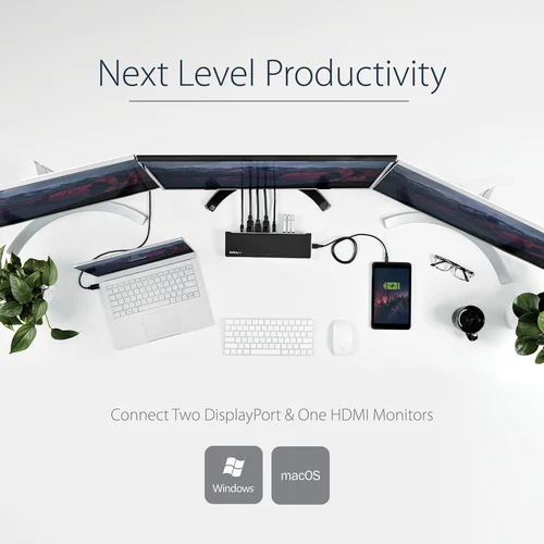 Port Replicator | Mac & Windows® | 4K DP | 5 USB ports | TAA CompliantThis triple-monitor docking station turns your USB 3.0 laptop into a full workstation with two DisplayPort outputs and an HDMI output. Plus, unlike some proprietary docks that only work with specific brands of laptop, this dock is universal, working with your Mac or Windows computer with USB 3.0.Triple Display FlexibilityThe USB 3.0 docking station adds triple-monitor support to your workstation, with resolution support up to 4K (3840 x 2160p) on one display and 2048x1152 on the other two. With more screens, combined with high resolution, the dock maximizes your screen real estate so you can simultaneously access multiple applications and compose on one display while referencing material on the other. You can also use your laptop screen for four displays in total, making it easy to manage several programs at once and avoid the nuisance of minimizing or rearranging windows.Powerful Connections and Fast Device ChargingTo support all of your USB peripherals, the docking station provides five USB 3.0 ports. The side-facing USB port is a USB fast-charge port (USB Battery Charging Specification 1.2), so you can charge your mobile devices faster than from standard USB ports, with or without your laptop connected to the dock. The dock also has a GbE port, headset jack and separate 3.5 mm audio and mic ports, so you’ll have all the connections you need to stay productive.The TAA compliant USB3DOCKH2DP is backed by a 3-year StarTech.com warranty and free lifetime technical support.The StarTech.com Advantage