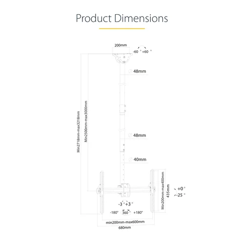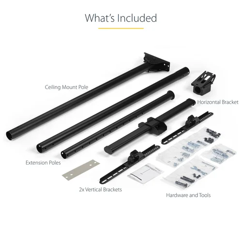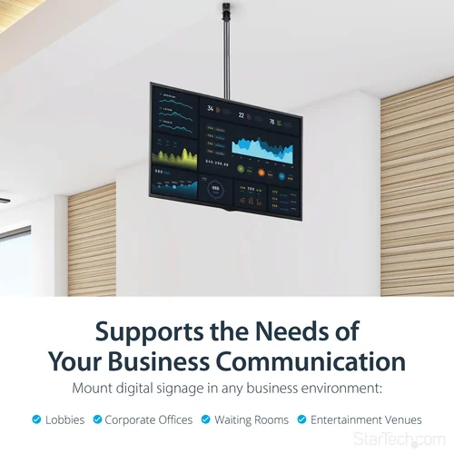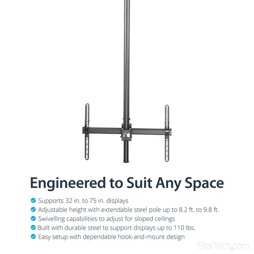 Display Ceiling Mount | Full Motion | For 32" to 75" DisplaysThis ceiling TV mount supports VESA mount compatible TVs from 32" to 75" in size, with a weight capacity of up to 110 lb. (50 kg). It lets you save wall and floor space by hanging your flat-panel LCD, LED or plasma TV from the ceiling in a prominent area.The ceiling mount is ideal for use in lobbies, entrances or other areas with high ceilings.Adjustable HeightWith a telescopic pole, the TV mount lets you suspend a display at your desired distance from the ceiling. This works well with a range of ceiling heights. The steel pole can extend from 8.2 to 9.84 ft. (2.5 to 3 m), with a total lift (height extension) of 19.6" (.5 m).Swivels to Suit Your CeilingThe flat-screen ceiling mount accommodates a wide variety of ceiling types. You can swivel the TV to work with virtually any type of ceiling for level viewing, including sloped ceilings (up to 60 degrees), and pitched or horizontal (flat) ceilings.Viewable from Any DirectionYou can adjust your TV to create a comfortable viewing angle, by tilting it up to -25 degrees down towards your audience for optimum visibility. Plus, the full-motion mount lets you swivel your display around the pole + 180 / - 180 degrees, without using tools.Hook-and-Mount DesignSimply attach the included vertical brackets, with built-in hooks, to the back of your TV. Once attached, hang your TV securely onto the ceiling mount. The +/-3 degree post-installation leveling adjustments ensure ideal positioning after hanging.FPCEILPTBLP is backed by a StarTech.com 5-year warranty and free lifetime technical support.The StarTech.com Advantage