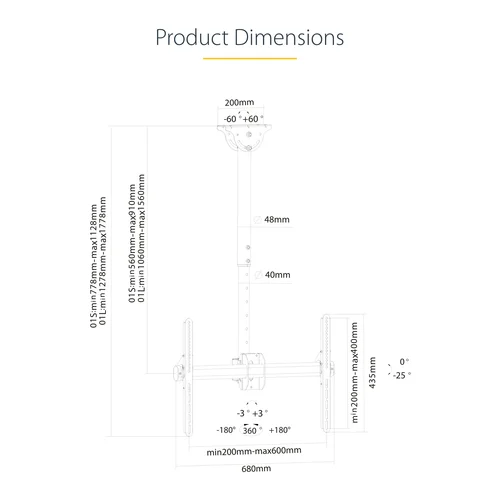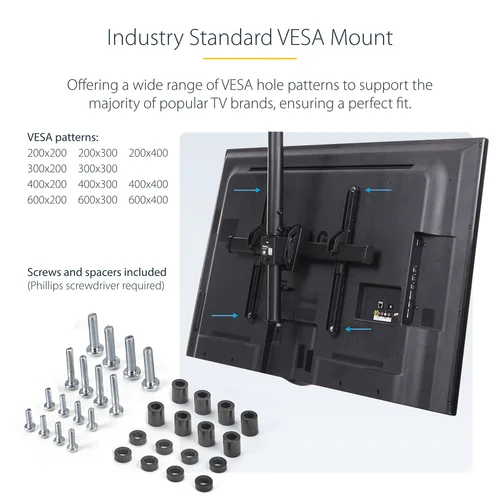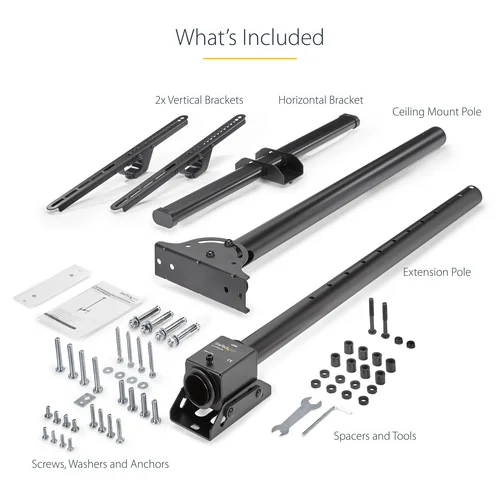 Display Ceiling Mount | Full Motion | For 32" to 75" DisplaysThis ceiling TV mount supports VESA mount compatible TVs from 32" to 75" in size, with a weight capacity of up to 110 lb. (50 kg). It lets you save wall and floor space by hanging your flat-panel LCD, LED or plasma TV from the ceiling in a prominent area.The ceiling mount is ideal for use in corporate boardrooms, lobbies, entrances, restaurants, bars and meeting places.Adjustable HeightWith a telescopic pole, the TV mount lets you suspend a display at your desired distance from the ceiling. This works well with a range of ceiling heights. The steel pole can extend from 42" to 61" (1060 to 1560 mm) , with a total lift (height extension) of 19.7" (500 mm).Swivels to Suit Your CeilingThe flat-screen ceiling mount accommodates a wide variety of ceiling types. You can swivel the TV to work with virtually any type of ceiling for level viewing, including sloped ceilings (up to 60 degrees), and pitched or horizontal (flat) ceilings.Viewable from Any DirectionYou can adjust your TV to create a comfortable viewing angle, by tilting it up to -25 degrees down towards your audience for optimum visibility. Plus, the full-motion mount lets you swivel your display around the pole + 180 / - 180 degrees, without using tools.Hook-and-Mount DesignSimply attach the included vertical brackets, with built-in hooks, to the back of your TV. Once attached, hang your TV securely onto the ceiling mount. The +/-3 degree post-installation leveling adjustments ensure ideal positioning after hanging.FLATPNLCEIL is backed by a StarTech.com 5-year warranty and free lifetime technical support.The StarTech.com Advantage