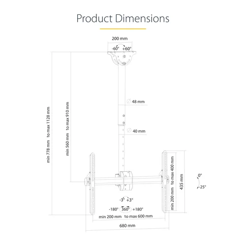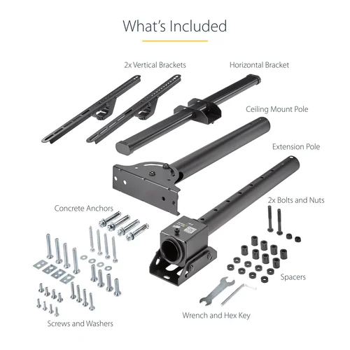 Display Ceiling Mount | Full Motion | For 32" to 75" DisplaysThis ceiling TV mount supports VESA mount compatible TVs from 32" to 75" in size, with a weight capacity of up to 110 lb. (50 kg). It lets you save wall and floor space by hanging your flat-panel LCD, LED or plasma TV from the ceiling in a prominent area.The ceiling mount is ideal for use in corporate boardrooms, lobbies, entrances, restaurants, bars and meeting places.Adjustable HeightWith a telescopic pole, the TV mount lets you suspend a display at your desired distance from the ceiling. This works well with a range of ceiling heights. The steel pole can extend from 22" to 33.5" (560 to 910 mm), with a total lift (height extension) of 13.7" (350 mm).Swivels to Suit Your CeilingThe flat-screen ceiling mount accommodates a wide variety of ceiling types. You can swivel the TV to work with virtually any type of ceiling for level viewing, including sloped ceilings (up to 60 degrees), and pitched or horizontal (flat) ceilings.Viewable from Any DirectionYou can adjust your TV to create a comfortable viewing angle, by tilting it up to -25 degrees down towards your audience for optimum visibility. Plus, the full-motion mount lets you swivel your display around the pole + 180 / - 180 degrees, without using tools.Hook-and-Mount DesignSimply attach the included vertical brackets, with built-in hooks, to the back of your TV. Once attached, hang your TV securely onto the ceiling mount. The +/-3 degree post-installation leveling adjustments ensure ideal positioning after hanging.FPCEILPTBSP is backed by a StarTech.com 5-year warranty and free lifetime technical support.The StarTech.com Advantage