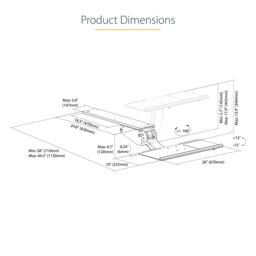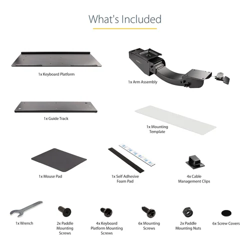 Under-Desk Keyboard Tray | Adjustable | Wrist Rest & Mouse PadThis under-desk keyboard tray adds comfort to your work day, by easing the strain on your wrists and arms. It also frees up valuable desk space.Spacious and Stable DesignThe spacious design of the keyboard tray, 26.4" (670 mm) width x 10" (255 mm) depth, gives you ample room for your full-size keyboard and mouse. Its quality construction, with a weight capacity of 4.4 lb. (2 kg), provides a stable platform that helps prevent the tray from shaking while you're typing.Wide Range of Movement to Maximize ComfortThe ergonomic design of this adjustable keyboard tray, including a built-in wrist rest (670mm x 28mm x 12mm) provides a wide range of movement to help reduce discomfort and increase productivity. It lets you adjust your position for comfortable arm and shoulder postures while typing, helping you be more productive throughout your work day.Easily adjust your spring-assisted keyboard tray down or up with the height adjustment paddle, with a total range of up to 13.4" (340 mm) that can be locked in at any position. You can slide the keyboard tray in or out from your desk to find your ideal position. Conveniently adjust the lever at the side to tilt the keyboard tray +15° / -13° for added comfort. You can even adjust your keyboard tray to the left or right, with +180° / -180° swivel.The under-table computer keyboard tray clears space on your desktop. The track-mounted design lets you slide it under your desk when not in use or extend it up to 18.5" (470 mm) from the edge of the desk.Simple InstallationThere is an included mounting template, which ensures precise installation, and a self-adhesive foam pad (150mm x 14mm) that helps to protect the underside of the desk when adjusting the height or swiveling the tray above the surface. Please note: the minimum required mounting surface space is 750mm (depth) x 147mm (width) and a desk thickness of 20mm.Four self-adhesive cable management clips are also included, ensuring an organized workspace and preventing cable interference when moving or adjusting the keyboard tray.The KBTRAYADJ2 is backed by a StarTech.com 2-year warranty and free lifetime technical support.The StarTech.com Advantage