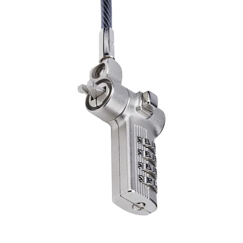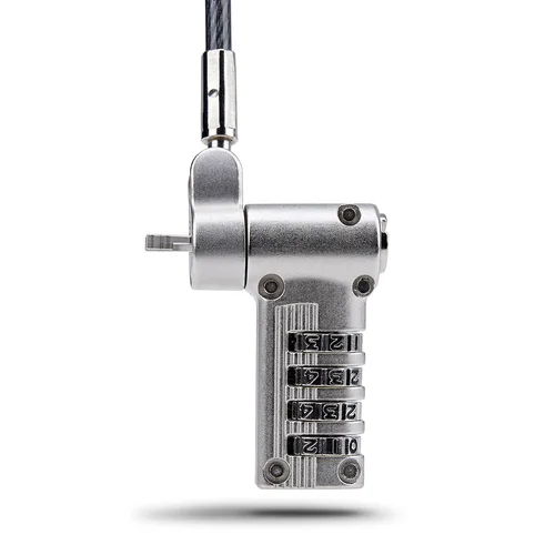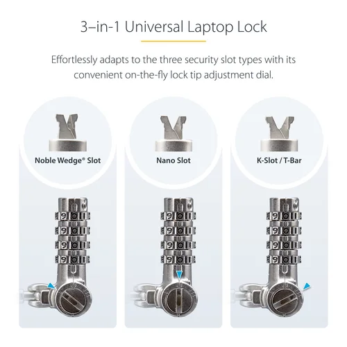 Secure a laptop, docking station, or other peripherals with this 3-in-1 serialized combination cable lockThe Universal Laptop Lock is a versatile solution compatible with Noble Wedge®; K-Slot (T-Bar), or Nano, providing flexibility and convenience.Adaptable SecurityA unique on-the-fly lock tip mechanism allows to quickly adapt the lock tip to different security slots. Simply rotate the lock selection dial to change the shape of the lock tip to match the security slot, all without the need to carry different lock tips or use special tools. The cut-resistant steel security cable is 6.6ft (2m) long and 0.17in (4.4mm) thick, providing reach and durability.Serialized Combination LockThe lock comes with its own pre-set combination code for streamlined security management for IT administrators. The lock can withstand a pull force of 202lb (91.6kg) for K-slot, 164.4lb (74.6kg) for Nano, and 110.2lb (50kg) for Noble Wedge®; ensuring your computer or other devices remains safe from theft.Note: The pull force values mentioned may vary if the security slots do not comply with the design standards specified by their respective manufacturers.Widely CompatibleThe versatile security lock is not limited to laptops or notebooks only. Use this lock to secure other devices such as docking stations, monitors, printers, SFF computers, projectors, oscilloscopes, or other office and lab equipment, expanding its utility. The lock is future-proof as it works with previous and newer computers from various brands, including HP, Dell, Microsoft, and more. Different thickness spacers are provided to ensure a better fit for your device.Full-Motion Lock DesignThe diameter of the lock head is 0.4in (14mm) and features a ball joint design that allows for 360° rotation and 90° pivot of the lock head. This flexibility reduces coiling and minimizes strain on the notebook slot, enhancing durability and usability.The StarTech.com Advantage