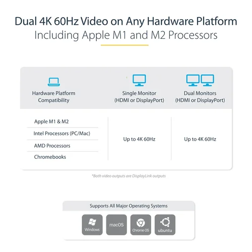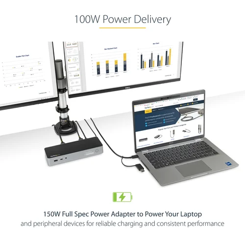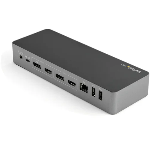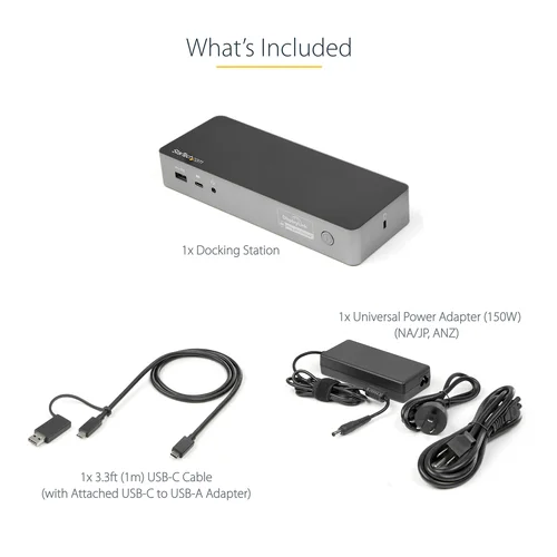 Dual 4K60 | DisplayPort and/or HDMI | USB-IF Certified | 3x USB-A | 1x USB-C | Mac, Windows® & Chrome OS™ | Lock SlotTransition from the legacy USB-A (USB 3.0) to the new USB-C with this certified universal laptop docking station for USB-C and USB-A laptops. The USB-C dock features 100W Power Delivery 3.0, dual HDMI and/or DisplayPort monitors, fast-charge, and both USB-C and USB-A peripheral ports.The Uniquely Universal Host CableThe USB-C dock comes with a universal host cable that is designed with an attached USB-C to USB-A adapter to accommodate USB-A laptops. The cable also features an extended length of 1 meter (3.3 ft.) to support a wide variety of workstation setups.Replacement or extra cables can be purchased separately here.100W Power DeliveryFor high performance laptops that require more charging power, the dock powers and charges your laptop as you work with 100W PD for faster charging, using the 150W power adapter - all through a single cable.Flexible Monitor ConnectionsThis is a dual 4K60Hz video docking station with support for both Ultra HD DisplayPort and/or HDMI monitors that lets you configure your video connections to best suit your needs.•Dual 4K DisplayPort | Up to 4096 x 2160p @ 60Hz•Dual 4K HDMI | Up to 4096 x 2160p @ 60Hz•Single 4K DisplayPort + Single 4K HDMI | Up to 4096 x 2160p @ 60Hz•Single 5K DisplayPort * | Up to 5120 × 2880*Requires monitor support for 5K using two DP portsCertified for Universal Compatibility & ReliabilityThis docking station is fully certified to meet top industry standards for USB-IF (USB 3.1 Gen 1, USB Type-C and Power Delivery), VESA DisplayPort and DisplayLink (video connections) certification to guarantee the highest quality, reliability, and compatibility.Easy and Convenient SetupFor fast setup right out of the box, the combo cable (USB-C with attached USB-A adapter) lets you connect any laptop. The dock has mounting holes for workstation mounting (bracket not included).The Connections You NeedConnect your devices with four USB 3.1 ports: 1x USB-C and 3x USB-A. Fast-charge your USB-C or USB-A smartphone. The dock provides a GbE port (PXE Boot support & Wake-on-LAN) and 3.5 mm 4-position headset audio jack. It also includes a security lock slot (K-slot) to protect against theft.For more installation flexibility, you can use StarTech.com mounting brackets (SSPMSUDWM & SSPMSVESA) that are specifically designed for our docks and hubs, to mount your dock to a desk, wall, or other surfaces to give you the customized setup you need.Enhance Productivity and Device Management with the StarTech.com Connectivity Tools ApplicationDeveloped to improve performance and security, StarTech.com Connectivity Tools is the only software suite on the market that works with a wide range of IT connectivity accessories. The software suite includes:•Advanced Windows Layout Utility : To setup and save custom windows layouts.•Mac Address Pass-Through Utility : To improve network security.•USB Event Monitoring Utility : To track and log connected USB devices•Wi-Fi Auto Switch Utility : Enabling users to quickly access faster network speeds via wired LAN.For more information and to download the StarTech.com Connectivity Tools application, please visit: www.StarTech.com/Connectivity-ToolsThe IT Pro's Choice Since 1985StarTech.com conducts thorough compatibility and performance testing on all our products to ensure we are meeting or exceeding industry standards and providing high-quality products to IT Professionals. Our local StarTech.com Technical Advisors have broad product expertise and work directly with our StarTech.com Engineers to provide support for our customers both pre and post-sales.DK30C2DPEPUE is backed by a StarTech.com 3-year warranty and free lifetime technical support.The StarTech.com Advantage