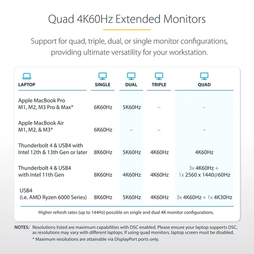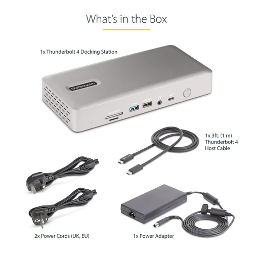 Transform a Thunderbolt 4 laptop into a high-resolution multi-monitor workstation with 7x USB ports, 2.5 Gigabit Ethernet port, 3.5mm audio, plus USB Power Delivery and downstream device chargingThis Thunderbolt 4 Certified docking station uses a single Thunderbolt 4/3 or USB4, port on a host computer to add high-performance connectivity while charging the laptop.Flexible High-Performance Video Supporting up to Quad-Monitor 4K 60HzThe dock is equipped with 2x HDMI and 2x DisplayPort video outputs for connecting multiple monitors to the host computer. The dock offers video flexibility, supporting single, dual, triple, or quad monitor configurations. With an Intel 12th Gen processor or higher that supports DP 1.4 with DSC, the docking station can support a quad-monitor configuration with resolutions up to 4K 60Hz. Quad displays are also available at lower resolutions or refresh rates on computers without DSC or with earlier Intel revisions. In addition, the dock supports a single 8K 60Hz display on either of the HDMI output ports.Apple computers equipped with M1, M2, or M3 Max/Pro processors support dual displays. For Apple computers featuring the M1, M2, or M3 base processor a single display is supported.Port ConnectivityThe docking station utilizes the high 40Gbps throughput available from a Thunderbolt 4/3, or USB4 port to provide a wide range of port connectivity to suit a variety of applications.The dock features:• 2x HDMI ports to connect displays• 2x DisplayPort ports to connect displays• 6x USB 3.2 ports (3x 10Gbps Type-A, 1x 10Gbps Type-C, 2x 5Gbps Type-A) to connect USB peripheral devices• 1x USB 2.0 (480Mbps) Type-A port that supports BC 1.2 with 7.5W (1.5A) for charging battery powered USB devices• 1x 2.5 Gigabit Ethernet port with PXE boot and WoL to connect to a wired Local Area Network (LAN)• 1x Secure Digital (SD) 4.0/UHS-II card reader to externally access SD, SDHC and SDXC memory cards• 1x Micro Secure Digital (microSD) 4.0/UHS-II card reader to externally access mSD, mSDHC and mSDXC memory cards• 1x 3.5mm 4-position TRRS Audio Jack to connect a 3.5mm headset98W USB Power Delivery CertifiedIncludes a 180W power adapter and supports 98W USB power delivery. This enables the dock to charge the laptop, with enough additional power for the downstream USB 2.0 port to support BC 1.2 with 7W (1.5A) for charging tablets, smartphones or other battery-powered USB devices.Enhance Productivity and Device Management with the StarTech.com Connectivity Tools AppDeveloped to improve performance and security, Connectivity Tools is the only software suite on the market that works with a wide range of IT connectivity accessories. The software includes:•Advanced Windows Layout Utility : To setup and save custom windows layouts.•Mac Address Pass-Through Utility : To improve network security.•USB Event Monitoring Utility : To track and log connected USB devices•Wi-Fi Auto Switch Utility : Enabling users to quickly access faster network speeds via wired LAN.For more information and to download the StarTech.com Connectivity Tools application, please visit: www.StarTech.com/Connectivity-ToolsThe StarTech.com Advantage