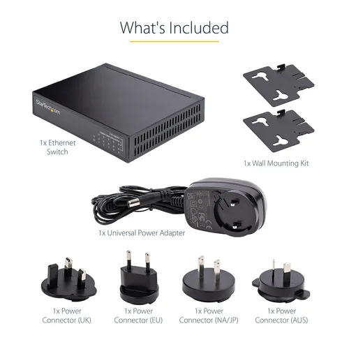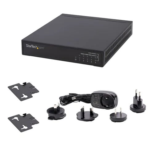 2.5G switch | Multi-Gigabit | 5 port | Unmanaged | Cat5e/Cat6/Cat6a cabling | Wall mount kit | K-slotThe unmanaged network switch offers five multi-speed Ethernet ports (10/100/1000/2500 Mbps) in a compact and durable all-metal casing while remaining silent and energy-efficient (IEEE 802.3az). The network switch is the ideal solution to dramatically speed up your network to support 2.5GBASE-T, and being an unmanaged switch, you can set it up in no time.Enhance your networkThis network switch allows you to use existing Cat5e/Cat6/Cat6a cabling to increase the bandwidth to 2.5 Gbps, ideal for large file transfers, streaming, network sharing/storage, or other bandwidth-intensive applications. Auto-negotiation detects the highest supported speeds on your devices for maximum performance and compatibility. You can also use it in combination with Wi-Fi 6 (802.11ax) wireless access points to expand your network range, bandwidth, and accessibility.Secure and versatileThe 2.5G switch offers a security K-slot for more permanent and secure setups (cable not included). The unintrusive design and small dimensions (6.1x4.7x1.1 inch / 155x120x30 mm) make it easily adaptable to any deployment and has clear diagnostic LEDs that show the status of the devices at a glance. Additional features such as 9K jumbo frames, full-duplex, 16K MAC address table, QoS IEEE 802.1p, and wall mounting kit give you the flexibility to use it in a multitude of scenarios.The DS52000 is backed for 2-years by StarTech.com, including free lifetime 24/5 multi-lingual technical assistance.The StarTech.com Advantage