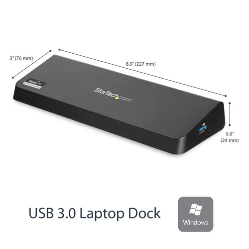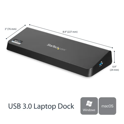 Laptop Docking Station | Mac & Windows® | USB Fast Charge Port | 4 USB Ports | TAA CompliantThis TAA compliant dual-monitor USB 3.0 docking station combines a 4-port USB 3.0 hub, headphone and microphone audio connectors, a USB fast-charge port, and a GbE RJ45 Port with Wake-on-LAN (WOL).4K Ultra HD ResolutionsThis 4K USB docking station supports DisplayPort plus HDMI dual video, or a single DP display at 4K Ultra HD resolutions (3840 x 2160p).Maximum Supported Resolutions*Video Output ConfigurationMax DisplayPort ResolutionMax HDMI ResolutionDisplayPort(Single Display)3840 x 2160p (4K)N/AHDMI(Single Display)N/A2560 x 1440pDisplayPort and HDMI(Two Displays)2048 x 1152p2048 x 1152p*Lower resolutions are also supported. For example, if the max is 3840 x 2160p (4K), it also supports 2560 x 1600p and 2560 x 1440p.Integrated USB 3.0 HubThe built-in USB hub features four USB 3.0 ports for connecting extra peripherals such as external hard drives or a wired mouse as if they are connected directly to your laptop.USB Fast ChargeThe USB 3.0 dock’s always-on USB fast-charge port charges devices without a laptop connection and supports USB Battery Charging Specification 1.2 making it easy to charge your tablets and other mobile devices.Direct Ethernet ConnectivityThe integrated RJ45 Ethernet port supports speeds of 10/100/1000Mbps, giving you an instant connection to a reliable wired network.Easy to UseThis docking station with DisplayPort and HDMI is universally compatible, working with Mac and Windows® USB 3.0 equipped laptops and includes a 2ft. USB 3.0 cable for quick setup.StarTech.com laptop docking stations can be used for cost savings and faster deployment with just a single cable. This USB 3.0 docking station is backed by a competitive 3-year warranty and free lifetime multilingual Technical Support.The StarTech.com Advantage