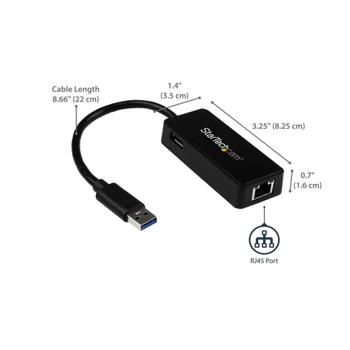 Add a Gigabit Ethernet port and a USB 3.0 pass-through port to your laptop through a single USB 3.0 portThe USB31000SPTB USB 3.0 to Gigabit Ethernet Adapter lets you add a Gigabit network port to your laptop or Ultrabookâ„¢ computer through a USB 3.0 port, and features an integrated USB 3.0 pass-through port that keeps your USB port available for use with other peripherals. The RJ45 port supports 10/100/1000 Mbps Ethernet and is fully compatible with IEEE 802.3i/u/ab standards. The network adapter is the ideal laptop accessory for your Microsoft Surfaceâ„¢ Pro 4, Surface Pro 3, Surface 3, Surface Pro 2 or Surface Book.An ideal replacement LAN adapter or laptop accessory, this compact USB 3.0 NIC leverages the 5 Gbps speed of USB 3.0 to provide full gigabit bandwidth and also offers backward compatibility with USB 2.0 systems (speed limited by USB bus).The adapter supports features such as IPv4/IPv6 packet Checksum Offload Engine (COE) and TCP large send offload to reduce the load on your CPU. Jumbo Frames, full-duplex operation with 802.3x flow control and VLAN tagging are also supported, making this an efficient and full-featured USB network adapter.Backed by a StarTech.com 2-year warranty and free lifetime technical support.The StarTech.com Advantage