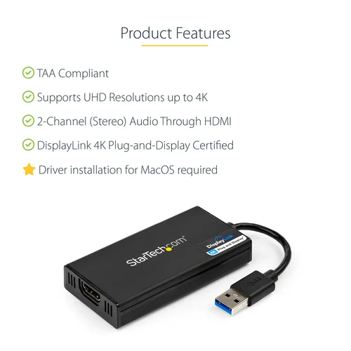 USB 3.0 External Video & Graphics Card | Multi-Monitor | USB-Powered | Supports Mac & Windows®Use this USB 3.0 to HDMI adapter to connect an HDMI monitor, projector or TV to your computer using a single USB Type-A port.Enhance Your ProductivityFunctioning as an USB external graphics card, this display adapter provides a convenient way to add multi-monitor capability to a USB 3.0 desktop or laptop computer.Leveraging the USB 3.0 interface, the adapter delivers ultrahigh definition content to your HDMI display. The adapter can be used to increase workstation productivity by extending your desktop or mirror your primary displayThe lightweight adapter dongle features a small footprint, making it the perfect accessory for professionals who work remotely from home or in an office environment.4K Picture QualityThe HDMI output on this USB 3.0 video adapter supports UHD resolutions up to 4K 30Hz. Even if your laptop or desktop video card doesn't natively support 4K output, the adapter allows you to connect a 4K HDTV, monitor or projector.For added convenience, the adapter is backward compatible with 1080p video resolutions.DisplayLink 4K Plug-and-Display CertifiedInstallation has never been easier. When you connect this DisplayLink 4K Plug-and-Display certified adapter to a Windows computer, it automatically downloads and installs the most up-to-date drivers for you, so you won't have to. This USB to HDMI adapter is compatible with any operating system, including Windows, macOS, ChromeOS and Linux.USB32HD4K is backed by a StarTech.com 2-year warranty and free lifetime technical support.The StarTech.com Advantage