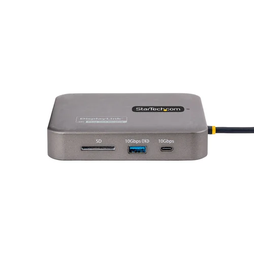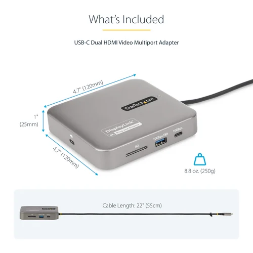 USB-C Dock | 2-Port USB 3.2 Gen 2 10Gbps Hub (1x USB-A, 1x USB-C) | Dual 4K 60HZ HDMI | 100W PD PassthroughThis USB-C Mini Dock / Multiport Adapter supports up to dual 4K 60Hz HDMI 2.0 converting your Dell XPS, MacBook or other USB-C laptop or tablet into a workstation, anywhere you go. The USB Type-C™ Multiport Adapter features 2x HDMI video outputs, a 2-Port USB 3.2 Gen 2 (10 Gbps) Hub (1x USB-A with B.C 1.2 charging, and 1x USB-C), an SD card reader, and Gigabit Ethernet. The adapter connects to your host computer's USB-C, USB4, or Thunderbolt 3/4™ port. Charge your host laptop and any attached USB peripherals by connecting the host laptop's power supply to the dedicated USB Power Delivery (PD) 3.0 port. The Multiport Adapter features an extra-long attached 22-inch (55 cm) host cable - for an extended reach, to offer more set up flexibility.DisplayLink Certified Dual 4K 60Hz HDMI VideoThe Mini Docking Station is DisplayLink Certified and supports high-performance dual-monitor 4K 60Hz video resolution with an integrated DisplayLink DL-6950 Controller. Multi-monitor performance makes this dock ideal for high-resolution applications such as video editing and graphic design. The Multiport Adapter supports ultrawide 21:9 aspect ratios, and lower resolutions like 1920x1200/1080p.Connect Your DevicesThe USB-C to USB 3.2 Gen 2 hub features two downstream 10 Gbps USB ports, including 1x USB-C data port for connecting your USB-C peripherals, and 1x USB-A data + 7.5W BC 1.2 charging port for connecting and charging USB-A peripherals.Multiple Use CasesA versatile dock solution for use at your office, home office, hotel, or in the boardroom, and is portable enough to be carried in your bag or backpack for mobile use. This lightweight USB-C Adapter can operate with bus-power alone, or use the dedicated USB-C Power Delivery port to connect a USB-C power adapter (not included with Multiport Adapter) for laptop charging.Built-In SD Card ReadersAccess your multimedia content with ease. The Multiport Adapter provides direct access to your SD, SDHC™ and SDXC™ memory cards.Charge Your LaptopWith support for USB Power Delivery 3.0 pass through (up to 82W for charging), the USB Type-C Multiport Adapter allows you to power and charge your laptop, when connected to a USB-C power source. PD 3.0 features Fast Role Swap (FRS) to prevent USB data disruption when you switch power sources (USB-C power adapter to bus power). This allows you to charge the connected host device, as well as any devices connected to the USB-A BC 1.2 charging port.Reliable Network ConnectivityThe Gigabit Ethernet port ensures reliable wired network access, with support for PXE Boot and WoL.Enhance Productivity and Device Management with the StarTech.com Connectivity Tools ApplicationDeveloped to improve performance and security, StarTech.com Connectivity Tools is the only software suite on the market that works with a wide range of IT connectivity accessories. The software suite includes:•Advanced Window Layout Utility : To set up and save custom window layouts.•MAC Address Pass-Through Utility : To improve network security.•USB Event Monitoring Utility : To track and log connected USB devices.•Wi-Fi Auto Switch Utility : Enabling users to quickly access faster network speeds via wired LAN.For more information and to download the StarTech.com Connectivity Tools application, please visit: www.startech.com/connectivity-toolsThis product is backed for 3-years by StarTech.com, including free lifetime 24/5 multi-lingual technical assistance.The StarTech.com Advantage