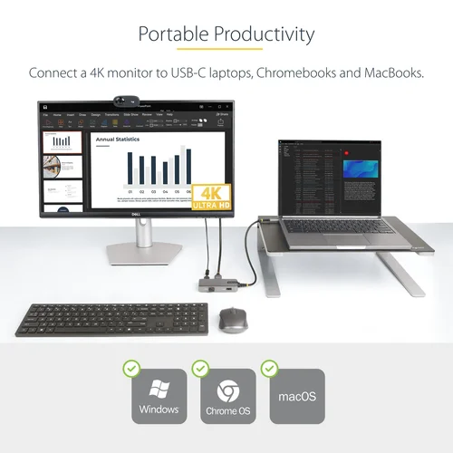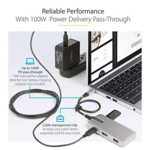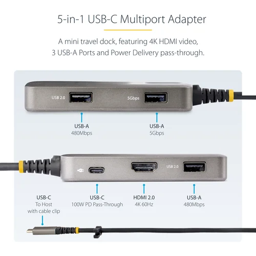 Built-in 1ft (30cm) USB-C Host Cable | 3-Port USB Type-A Hub (1x USB 3.2 Gen 1 5Gbps, 2x USB 2.0 480Mbps) | HDMI 2.0b (HDR) 4K 60HzThis Works With Chromebook (WWCB) certified USB-C Multiport Adapter supports up to 4K 60Hz HDMI 2.0b (HDR10) via DP Alt Mode. The USB-C dock converts a USB-C laptop or tablet, such as a Chromebook, Dell XPS, or a MacBook, into a workstation. The adapter connects to your host computer's USB-C, USB4, or Thunderbolt™ 3/4 port. It features one HDMI video output, and a 3-Port USB Hub (1x USB 3.2 Gen 1 5Gpbs, 2x USB 2.0 480Mbps). Connect a laptop USB-C power supply to the dedicated USB Power Delivery (PD) 3.0 port, located on the Multiport Adapter, to charge the laptop. The Multiport Adapter features an extra-long built-in 12-inch (30 cm) USB-C host cable.Works With Chromebook (WWCB) certifiedThis USB-C Multiport Adapter is tested and certified to meet Google's compatibility standards ensuring seamless operation with Chromebook devices. The Multiport Adapter is ideal for setup and deployment in business and education environments. Automatic firmware updates are available through ChromeOS for maximum security, compatibility, and performance.Connect USB PeripheralsThe USB-C to USB-A hub features three USB Type-A ports, including one USB 3.2 Gen 1 (5Gbps) port, and two USB 2.0 (480Mbps) ports for connecting USB peripherals.Multiple Use CasesA versatile dock solution for use at your office, home office, hotel, or in the boardroom. It's portable enough to be carried in a bag or backpack. This lightweight USB-C Adapter can operate with bus-power alone, or use the dedicated USB-C Power Delivery port to connect a USB-C power adapter (not included with Multiport Adapter) for laptop charging.Charge Your LaptopConnect a USB-C power source (not included), such as the power adapter included with a laptop, to the USB-C Power Delivery pass-through port. With support for USB Power Delivery 3.0 pass-through (up to 100W), the USB Type-C Multiport Adapter allows you to power and charge your laptop. USB PD 3.0 features Fast Role Swap (FRS) to prevent USB data disruption when disconnecting the power source.Enhance Productivity and Device Management with the StarTech.com Connectivity Tools ApplicationDeveloped to improve performance and security, StarTech.com Connectivity Tools is the only software suite on the market that is compatible with a wide variety of IT connectivity accessories. The software suite includes:•Advanced Windows Layout Utility : Setup and save custom windows layouts.•USB Event Monitoring Utility : Track and log connected USB devices.For more information and to download the StarTech.com Connectivity Tools application, please visit: www.startech.com/connectivity-toolsThis product is backed for 3-years by StarTech.com, including free lifetime 24/5 multi-lingual technical assistance.This product works with devices capable of running the latest version of ChromeOS and has been certified to meet Google's compatibility standards. Google is not responsible for the operation of this product or its compliance with safety requirements. Android, Chromebook and the Works With Chromebook badge are trademarks of Google LLC. Thunderbolt is a trademark of Intel Corporation.The StarTech.com Advantage