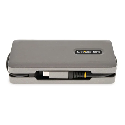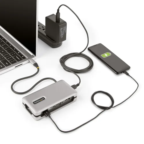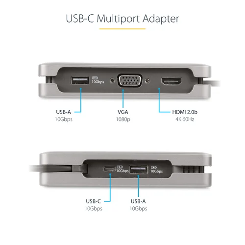Create a workstation, with a single 4K 60Hz HDMI or 1080p VGA, multiple USB ports, Gigabit Ethernet, and 100W Power Delivery pass-throughConnect this USB Type-C Multiport Adapter to a USB-C, USB4, or Thunderbolt 3/4™ laptop to enable single-display 4K 60Hz HDMI 2.0b or 1080p 60Hz VGA video output via DP Alt Mode. The USB-C dock works with USB Type-C laptops or tablets, such as a Chromebook, Dell XPS, or MacBook. It features a 3-Port USB 3.2 Gen 2 (10Gbps) Hub (2x USB-A, 1x USB-C), and Gigabit Ethernet. Connect the laptop USB-C power supply to the dedicated USB Power Delivery (PD) 3.0 port, to charge the laptop.Extra-Long Cable with Built-in Cable ManagerThe Multiport Adapter features an extra-long attached 12.6in. (32cm) USB-C host cable. The Thermoplastic Elastomer (TPE) cable jacket is softer and more flexible than PVC jacketed cables. The extra-long cable reduces port/connector strain, particularly when laptops are placed on riser stands, or on 2-in-1 devices with raised USB-C ports, such as the Microsoft Surface. In addition, the Multiport Adapter also features an innovative wrap-around cable manager that facilitates tangle-free storage in a laptop bag.USB 3.2 Gen 2 HubConnect one USB-C and two USB-A peripherals to the USB 3.2 Gen 2 (10Gbps) ports.Multiple ApplicationsA versatile solution for adding docking station capabilities in an office, home office, hotel, or in the boardroom. It's portable enough to be carried in a bag or backpack. This lightweight USB-C Adapter can operate with bus-power alone or connect a USB-C power adapter (not included with Multiport Adapter) for laptop charging.USB PD 3.0 features Fast Role Swap (FRS) to prevent USB data disruption when disconnecting the power source.Wired Gigabit Network ConnectivityThe Gigabit Ethernet port ensures reliable wired network access, with support for PXE Boot and Wake-on-LAN (WoL).Enhance Productivity and Device Management with the StarTech.com Connectivity Tools ApplicationDeveloped to improve performance and security, StarTech.com Connectivity Tools is the only software suite on the market that is compatible with a wide variety of IT connectivity accessories. The software suite includes:•Advanced Windows Layout Utility : Setup and save custom windows layouts.•MAC Address Pass-Through Utility : Improve network security.•USB Event Monitoring Utility : Track and log connected USB devices.•Wi-Fi Auto Switch Utility : Enable quick access to wired LAN.For more information and to download the StarTech.com Connectivity Tools application, please visit: www.startech.com/connectivity-toolsThis product is backed for 3 years by StarTech.com, including free lifetime 24/5 multi-lingual technical assistance.The StarTech.com Advantage