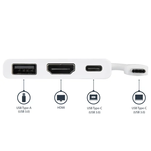 USB-C™ Video Adapter | Mac & Windows® | 4K 30Hz | Thunderbolt™ 3 CompatibleThis USB-C™ multiport adapter with HDMI lets you add vital connections to your MacBook or Windows laptop, through a single USB-C port.Connect a UHD 4K HDMI MonitorFor maximum productivity, connect your USB-C or Thunderbolt 3 laptop to a 4K 30Hz monitor, using this USB-C to 4K HDMI adapter. You can also connect to an HDMI projector or TV in a boardroom or other meeting space, to deliver presentations on a shared screen.Charge Your LaptopThe USB-C adapter lets you power and charge your USB-C laptop during a presentation or while you’re working, with a USB-C Power Delivery port. Even if your laptop has only a single USB-C port available, you can keep your laptop powered.Add a USB 3.0 PortThis USB-C multiport adapter offers a USB 3.0 port that's backward compatible with older USB devices - ideal for data transfers, syncing, or charging your mobile devices.Travel-Friendly DesignThe compact all-in-one adapter is a vital accessory for your USB-C laptop. With its small-footprint design, you can take it with you anywhere you would use your laptop.CDP2HDUACPW is backed by a StarTech.com 3-year warranty and free lifetime technical support.Note: To ensure full adapter functionality, your laptop’s USB-C port must support USB Power Delivery and DP Alt Mode.The StarTech.com Advantage