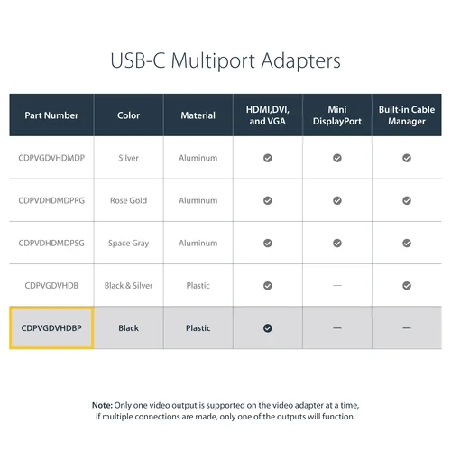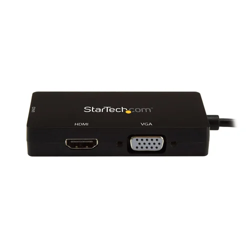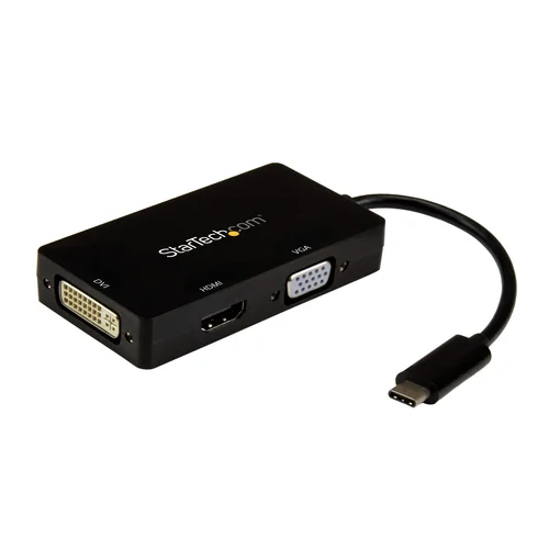 USB Type-C™ to VGA DVI or HDMI Travel Adapter | 3-Year WarrantyThis USB-C™ multiport video adapter offers a portable solution for connecting your USB Type-C laptop to a VGA, DVI or HDMI® display.All-in-One Video Connectivity, with Travel in MindAvoid the hassle of carrying different adapters for different displays with this 3-in-1 USB-C adapter. With VGA, DVI and HDMI output, you can connect your laptop to virtually any display.Astonishing Picture QualityThe HDMI output on this USB-C video adapter supports UHD 4K resolutions, providing four times the picture quality of high-definition 1080p. All of the outputs (HDMI, VGA, DVI) can support high-definition resolutions of up to 1920 x 1200.Maximum PortabilityThe convenient plug-and-play USB-C dongle is the perfect travel accessory. Fitting easily into your laptop bag, and offering three video output options, the USB-C display adapter is an ideal solution for Bring Your Own Device (BYOD) applications, wherever you go.The CDPVGDVHDBP is backed by a StarTech.com 3-year warranty and free lifetime technical support.The StarTech.com Advantage