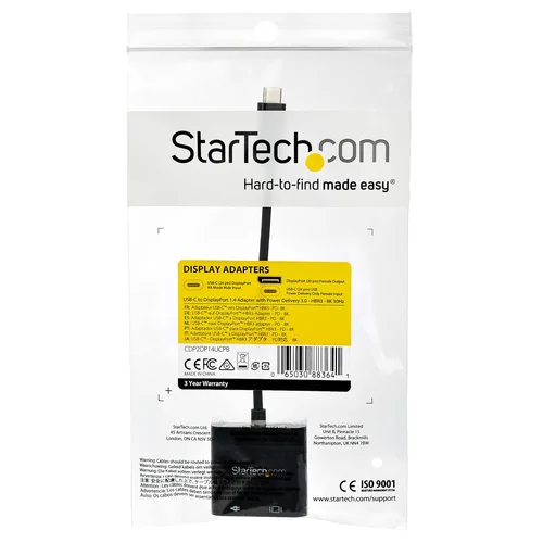 DisplayPort™ 1.4 Adapter | Thunderbolt™ 3 Compatible | HBR3 | 60W PDThis USB-C™ to DisplayPort™ adapter lets you connect your USB Type-C or Thunderbolt 3 device to a DisplayPort display, providing you with a convenient, high-performance solution. The adapter features USB Power Delivery so you can power and charge your devices while outputting Ultra HD video.Power & Video with USB Power DeliveryThis USB-C display adapter supports USB Power Delivery up to 60 watts and features an additional USB-C port so you can charge your laptop or tablet using its USB-C power adapter.IT Pro PerformanceThis adapter features a unique video signal booster which amplifies the signal and ensures reliable performance, even with lower quality cables. The amplifier also increases the max. supported DP cable length compared to other brands.Incredible 8K Picture QualityDelivering cutting-edge picture quality, this 8K DisplayPort 1.4 adapter supports UHD resolutions up to 7680x4320, and also features HBR3 functionality, providing a bandwidth of up to 32.4Gbps. With HDR support, you can enjoy lifelike images with increased contrast, brightness and colors and greater luminosity than standard digital imaging.The DisplayPort dongle is also backward compatible with 4K and 1080p displays, which makes it a great accessory for home, office or other work environments, while future-proofing for 8K implementation.Ideal for TravelThis lightweight display adapter is highly portable, with a small-footprint design. It's the perfect accessory for your MacBook, Microsoft Surface Book or other USB-C (or Thunderbolt 3) device, fitting perfectly into your carrying case.CDP2DP14UCPB is backed by a 3-year StarTech.com warranty and free lifetime technical support.Note:• Your USB-C device must support DisplayPort Alternate Mode to work with this adapter.• To achieve 8K resolutions, your source and your destination must support DisplayPort 1.4.The StarTech.com Advantage