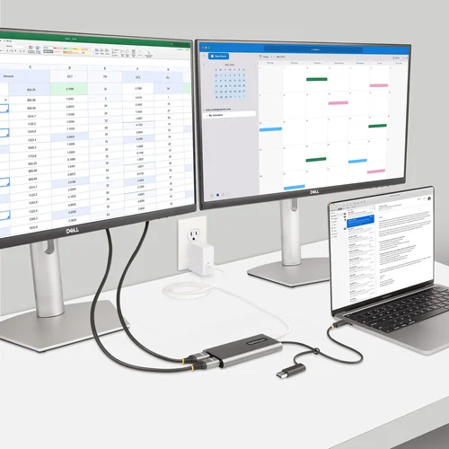 Dual 4K 60Hz HDMI Output | Attached USB-C to USB-A DongleConnect two 4K 60Hz HDMI displays to the USB Type-C or Type-A port of a laptop/desktop computer, using this USB-C to Dual-HDMI Adapter.Power Delivery Pass-ThroughThe USB video adapter features USB Power Delivery (PD) 3.0 pass-through (up to 100W), enabling powering and charging of a laptop when connected to a USB-C power adapter. The adapter runs on USB bus-power when no USB-C power adapter is connected. PD 3.0 features Fast Role Swap (FRS) that prevents USB data disruption when USB-C power is disconnected and the adapter switches to USB bus power.DisplayLink Certified 4K 60Hz ResolutionThe USB multi-monitor adapter is DisplayLink Certified and supports high-performance dual-monitor 4K 60Hz video resolutions with an integrated DisplayLink DL-6950 Controller.Comprehensive CompatibilityThe USB video adapter is compatible with Windows, macOS, Ubuntu, and Chrome OS. The integrated USB-C to USB-A adapter enables the flexibility of connecting to any host that is running a compatible operating system. The built-in 1ft (30cm) USB-C/A cable is ideal for on the go use. The length of the cable and the strain reliefs reduce connector/port strain.This product is backed for 3-years by StarTech.com, including free 24/5 multi-lingual technical assistance.The StarTech.com Advantage
