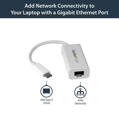 Add a Gigabit Ethernet port to your MacBook, Chromebook or laptop with USB Type-CNow you can easily connect to a Gigabit network through the USB-C™ or Thunderbolt™ 3 port on your laptop or desktop computer. This Gigabit Ethernet (GbE) network adapter provides a reliable network connection without even having to install drivers. It’s ready to go, with native driver support to ensure a quick setup.Powerful Gigabit network connectionsThe USB Type-C™ network adapter supports full Gigabit bandwidth by harnessing the performance of USB 3.2 Gen 1 (5 Gbps). You can access very large files over the network at Gigabit speeds.Native driver support makes installation easyGet up and running quickly. Simply plug the adapter into the USB-C port on your laptop and connect to your network. The network adapter chipset provides native driver support, so you don't have to worry about installing additional software.Trouble-free connections through USB-CThe USB Type-C connector is smaller and easier to use than previous USB connectors. It’s a reversible plug so you can connect to your devices with either side facing up. You can insert the cable the right way every time - without frustration or the risk of port damage.Compact and lightweight for perfect portabilityCompact and portable, this USB Gigabit network adapter is the ideal desktop network adapter or laptop accessory. It’s powered directly from the USB port making it easy to connect when you’re on the go. Plus, its lightweight design makes the adapter the perfect travel accessory for your Chromebook Pixel™ or MacBook.The US1GC30W features a white design that looks great with your Apple Mac and is backed by a StarTech.com 2-year warranty and free lifetime technical support.The StarTech.com Advantage