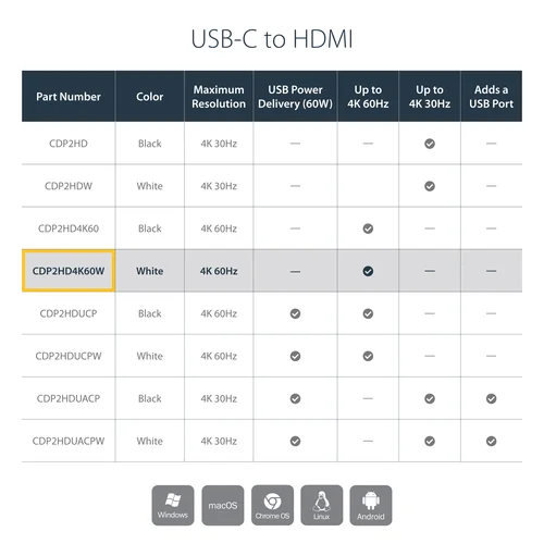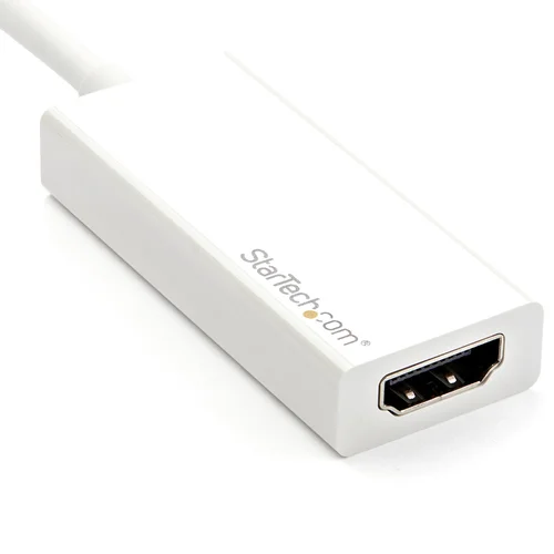 Connect your USB Type-C laptop to an Ultra HD 60Hz display or projectorThis USB-C™ to HDMI® adapter lets you output HDMI video and audio from a USB Type-C™ device, with support for Ultra HD 4K at 60Hz. The adapter works with USB-C devices that pass a DisplayPort video signal, and it's also compatible with Thunderbolt™ 3 ports. The USB-C video adapter features a sleek white design that looks great with your USB Type-C enabled MacBook or HP® ENVY 13.Astonishing Picture QualityThe adapter lets you harness the video capabilities that are built into your USB Type-C connection, to deliver the astonishing quality of UHD to your 4K 60Hz display. This makes it easier for you to multitask, while working on the most resource-demanding applications imaginable. With this adapter, you can achieve an output resolution of up to 3840 x 2160p at 60Hz, which is perfect for performing high-resolution tasks such as viewing and editing 4K video.The adapter is backward compatible with 1080p displays, which makes it a great accessory for home, office or other workspace applications.The Perfect Travel CompanionWith its all-white design, this USB-C video adapter is the perfect accessory for your MacBook with USB-C. The adapter is compact and lightweight so it fits easily into your MacBook bag or carrying case, which is great for BYOD (Bring Your Own Device) applications at the office. While the adapter looks great next your Mac and HP ENVY, it also works with any USB-C computer that supports DisplayPort ALT mode, such as your Windows® laptop.Hassle-Free Connection with USB Type-CThis adapter lets you utilize the versatile USB Type-C port on your portable device. USB Type-C is a reversible connector, so it doesn't matter which way you plug it in. The reversible connector means you will always plug it in correctly on your first try. It saves you the hassle and distraction of repeatedly attempting to connect your laptop to a display or projector, while you're delivering a presentation or speaking to a group.The CDP2HD4K60W is backed by a 3-year StarTech.com warranty and free lifetime technical support.Note:• Your USB-C equipped device must support video to work with this adapter.• This product may experience display detection issues with certain models of Mac. If you’re experiencing issues please contact our technical support. For hassle-free compatibility with Mac we recommend CDP2HD4K60H.The StarTech.com Advantage