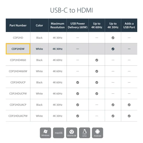 USB Type-C™ to HDMI Converter | Thunderbolt™ 3 Compatible | DP Alt ModeThis USB-C to HDMI adapter lets you to output 4K video and audio from the USB Type-C port on your laptop to an HDMI display or projector. The adapter works with USB 3.1 or Thunderbolt 3 Type-C devices that pass a DP video signal, such as your MacBook Pro, Chromebook or 2018 iPad Pro.This video adapter is also available in black (CDP2HD).Enjoy High-Definition Resolution up to 4K at 30HzThis adapter lets you harness the video capabilities from your computer's USB-C connection, to deliver the astonishing quality of UHD to a 4K 30Hz display.You can achieve an output resolution of up to 3840 x 2160p at 30Hz, perfect for performing high-resolution tasks. Plus, the USB-C display adapter is backward compatible with 1080p monitors and displays, making it a great accessory for any workspace application.Hassle-Free Connection to Your USB Type-C LaptopThis HDMI converter lets you use the versatile USB Type-C port on your portable device. USB-C is a reversible connector, so you can plug it to your device in any direction. Plus, it’s Thunderbolt 3 compatible, providing a hassle-free connection to your Windows or Mac-based Thunderbolt 3 computer.Lightweight Design Makes it the Perfect Travel CompanionThis compact, lightweight USB-C video adapter is easy to carry in your laptop bag. It's ideal for BYOD (Bring Your Own Device) applications at the office and is compatible with any device that supports USB-C DP Alt Mode.CDP2HDW is backed by a 2-year StarTech.com warranty and free lifetime technical support.The StarTech.com Advantage